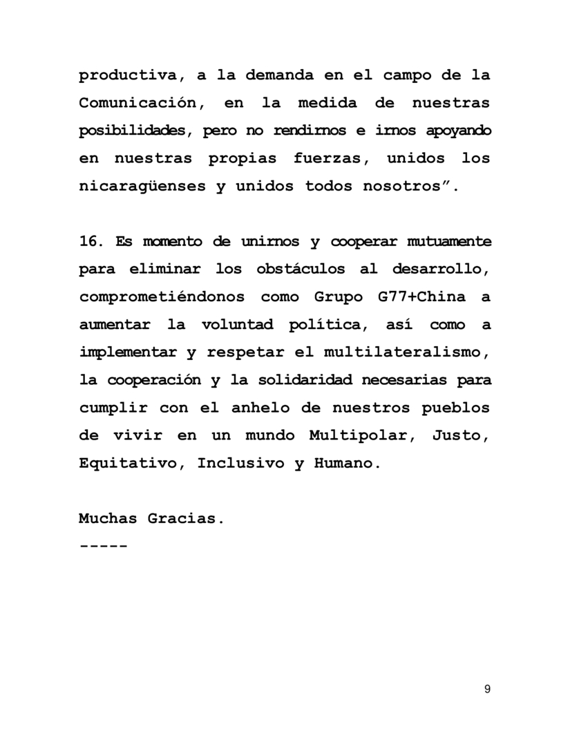 16. Es momento de unirnos y cooperar mutuamente para eliminar los obstáculos al desarrollo, comprometiéndonos como Grupo G77+China a aumentar la voluntad política, así como a implementar y respetar el multilateralismo, la cooperación y la solidaridad necesarias para cumplir con el anhelo de nuestros pueblos de vivir en un mundo Multipolar, Justo, Equitativo, Inclusivo y Humano.