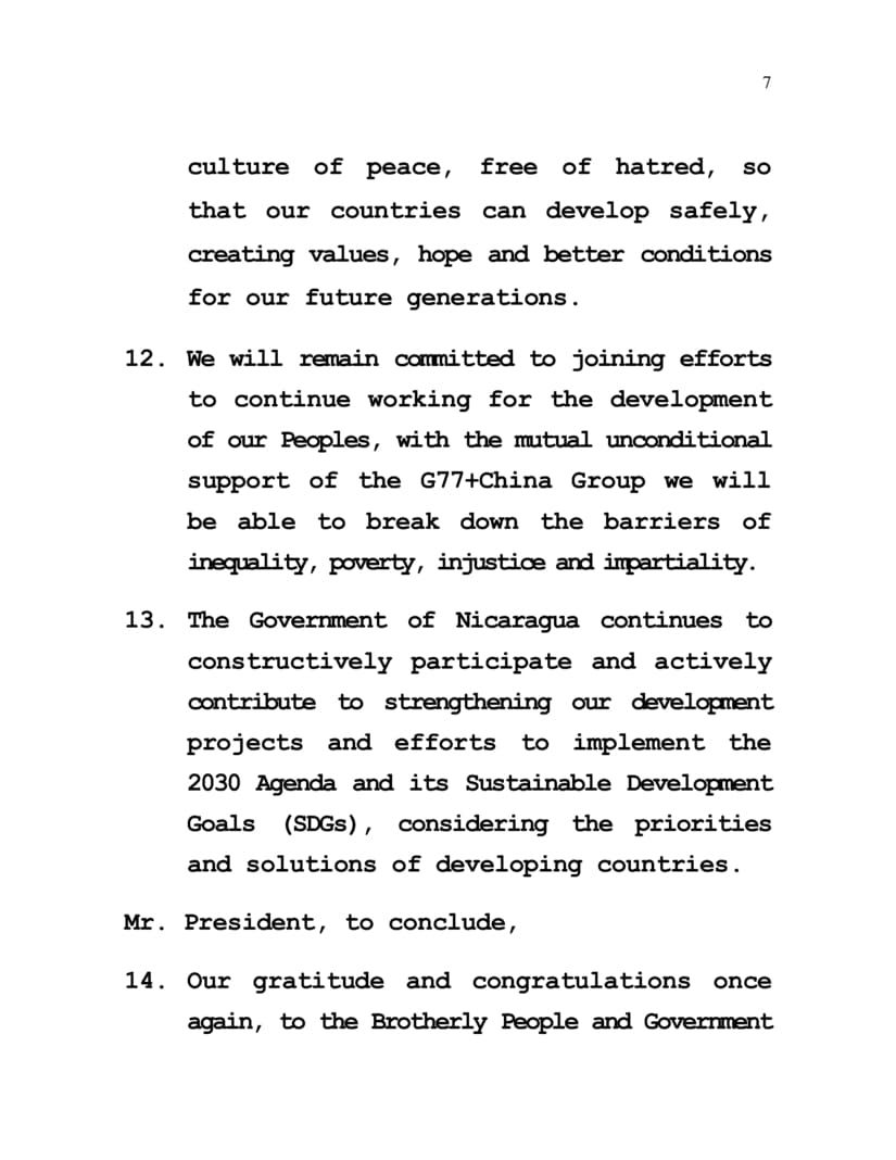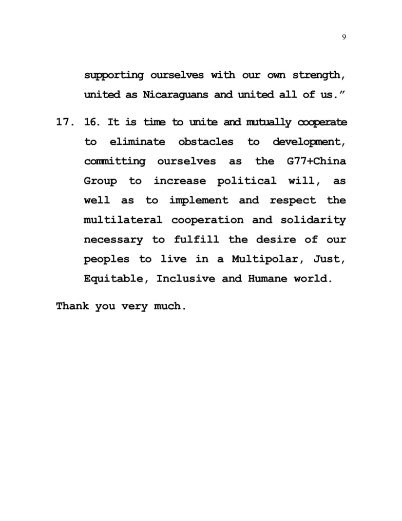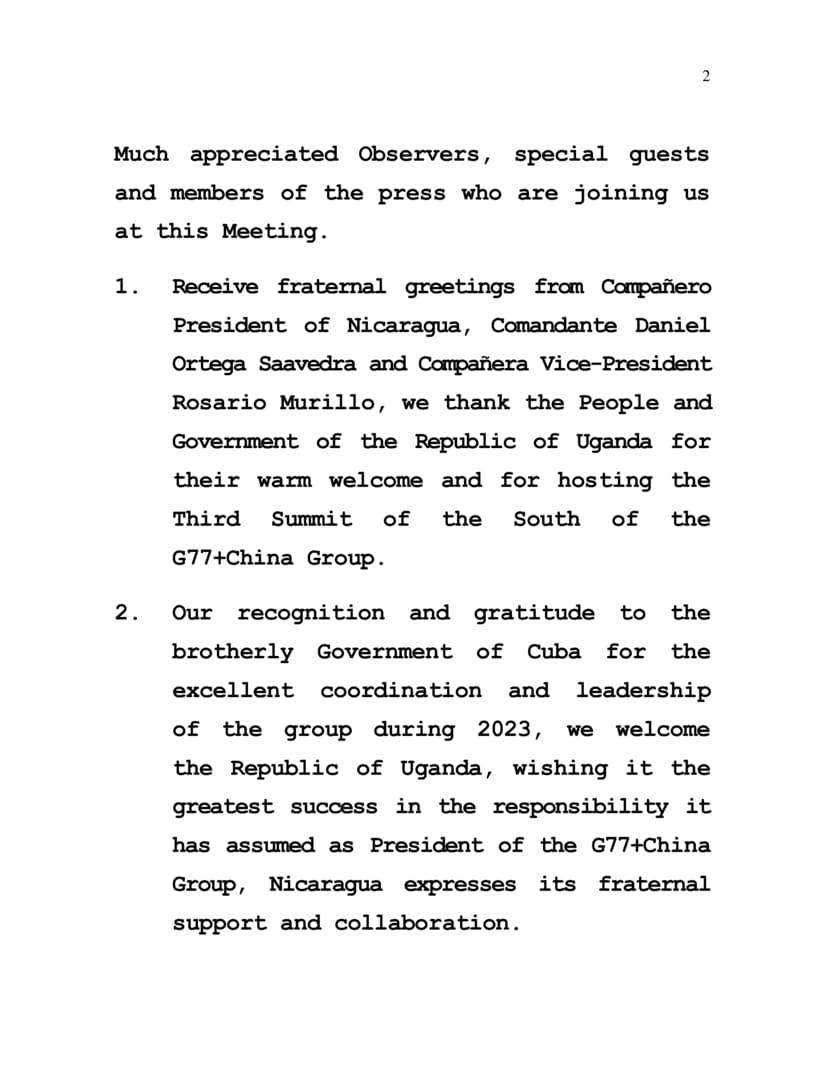 2. Our recognition and gratitude to the brotherly Government of Cuba for the excellent coordination and leadership of the group during 2023, we welcome the Republic of Uganda, wishing it the greatest success in the responsibility it has assumed as President of the G77+China Group, Nicaragua expresses its fraternal support and collaboration.