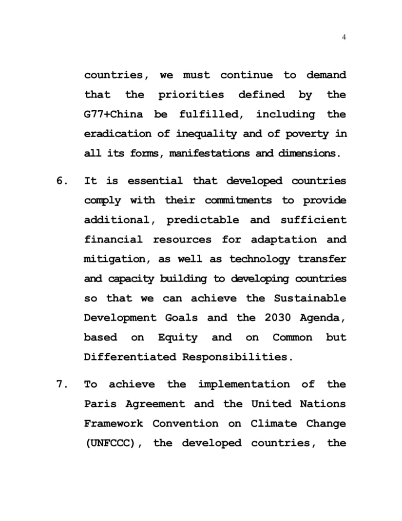 3. Today, the Member States of the G77+China Group have come together with one voice from the Global South reaffirming our commitment to unity, solidarity and mutual cooperation to move towards a more just, equitable and multipolar world for our developing countries.