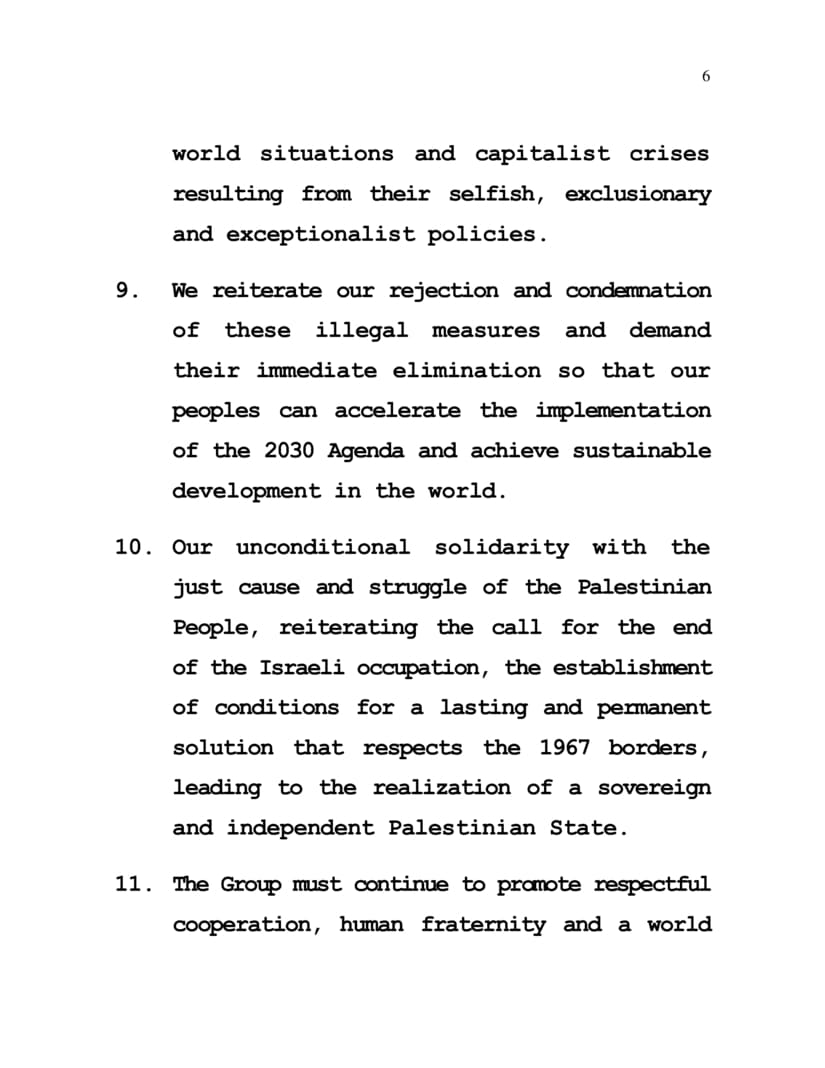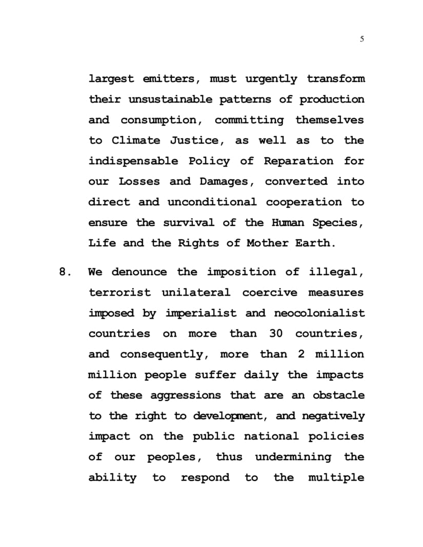 8. We denounce the imposition of illegal, terrorist unilateral coercive measures imposed by imperialist and neocolonialist countries on more than 30 countries, and consequently, more than 2 million million people suffer daily the impacts of these aggressions that are an obstacle to the right to development, and negatively impact on the public national policies of our peoples, thus undermining the ability to respond to the multiple world situations and capitalist crises resulting from their selfish, exclusionary and exceptionalist policies.