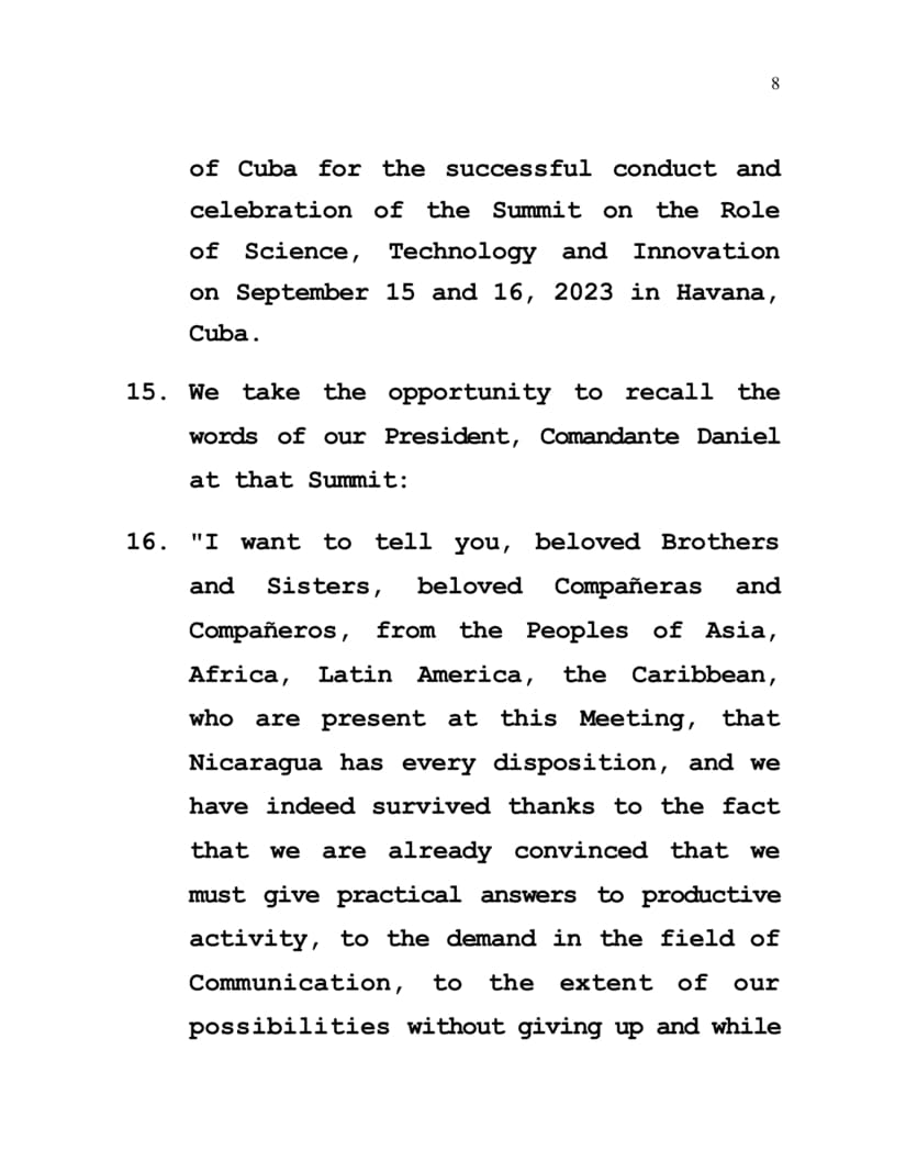 16. "I want to tell you, beloved Brothers and Sisters, beloved Compañeras and Compañeros, from the Peoples of Asia, Africa, Latin America, the Caribbean, who are present at this Meeting, that Nicaragua has every disposition, and we have indeed survived thanks to the fact that we are already convinced that we must give practical answers to productive activity, to the demand in the field of Communication, to the extent of our possibilities without giving up and while supporting ourselves with our own strength, united as Nicaraguans and united all of us.”