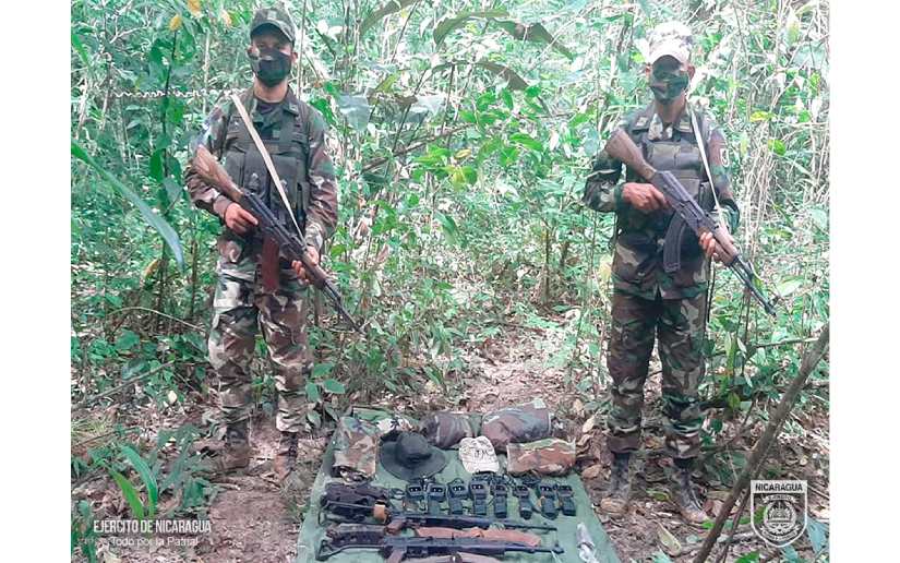 El Ejército de Nicaragua consecuente con el lema de que “Somos el Pueblo mismo uniformado trabajando en su propio beneficio”, en cumplimiento al Plan de Protección de las Fronteras Estatales y a la Estrategia de Estado “Muro de Contención”, el 18 de enero de 2024, a través de servicio operativo del 6 Comando Militar Regional, en la ribera del río de la comunidad fronteriza Mollejones, ubicada a 13 kilómetros al noroeste de la comunidad Wamblán, municipio de Wiwilí, departamento de Jinotega, ocuparon 2 fusiles AKMS, 6 cargadores, 153 cartuchos M-43 mm, 11 cartuchos 38 mm, 8 radios de comunicación portátiles con su respectivos cargadores, 1 talí de pistola, 3 capotes, 1 uniforme camufle (comercial), 1 sombrero verde olivo, 1 gorra civil y 5 libras de marihuana, que eran trasladadas por sujetos que se dieron a la fuga al detectar la presencia de la tropa.