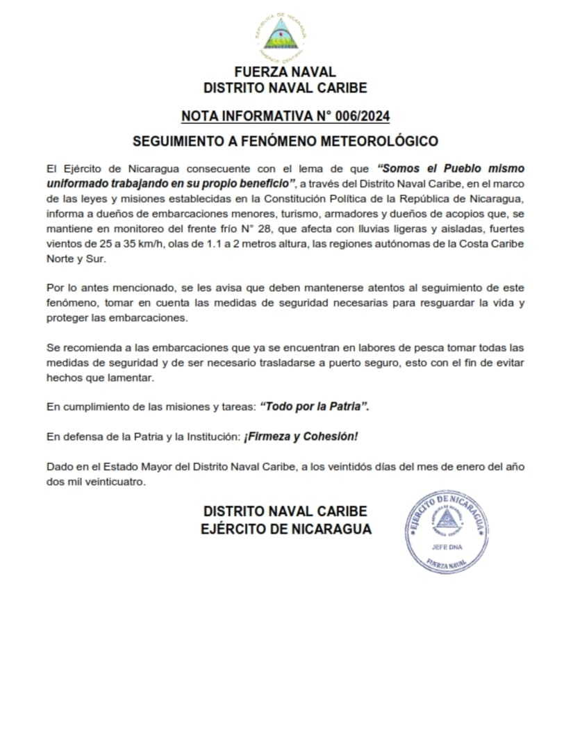 El Ejército de Nicaragua consecuente con el lema de que “Somos el Pueblo mismo uniformado trabajando en su propio beneficio”, a través del Distrito Naval Caribe, en el marco de las leyes y misiones establecidas en la Constitución Política de la República de Nicaragua, informa a dueños de embarcaciones menores, turismo, armadores y dueños de acopios que, se mantiene en monitoreo del frente frío N° 28, que afecta con lluvias ligeras y aisladas, fuertes vientos de 25 a 35 km/h, olas de 1.1 a 2 metros altura, las regiones autónomas de la Costa Caribe Norte y Sur.