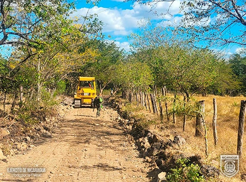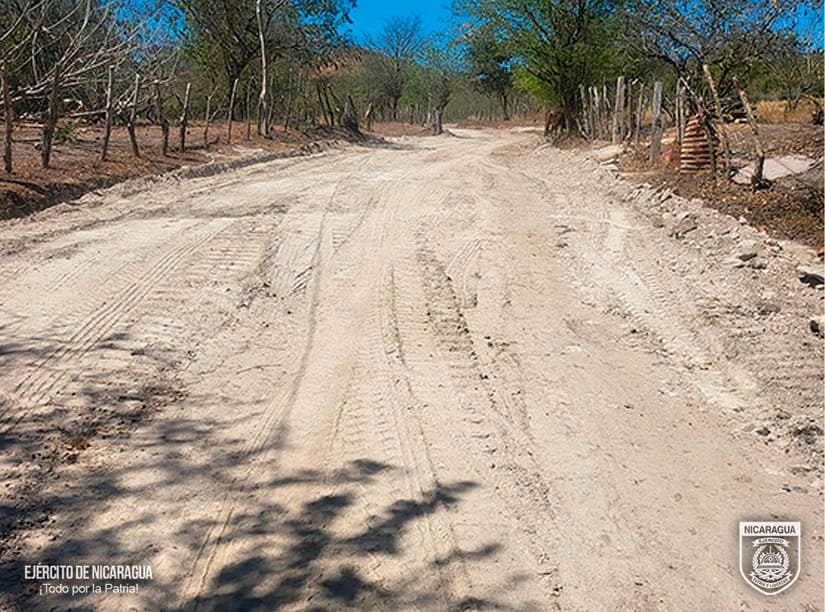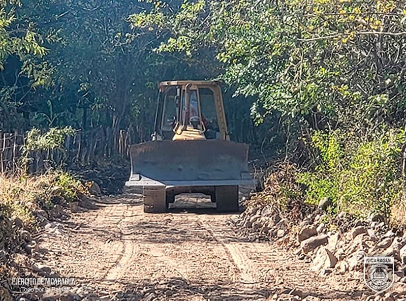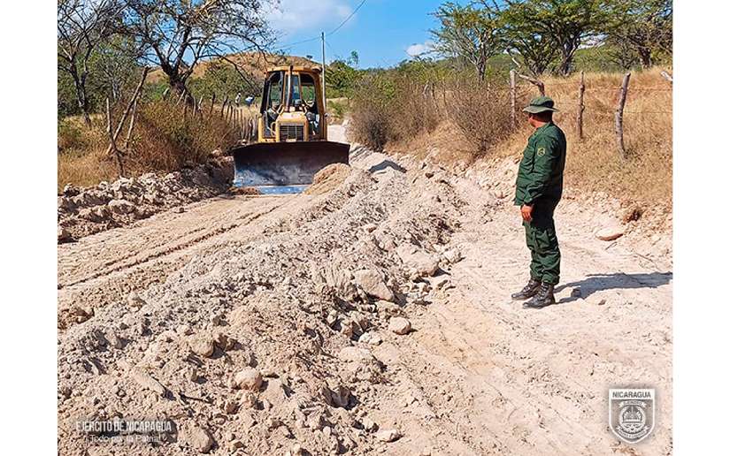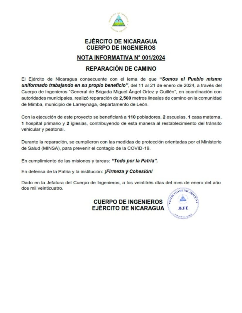 El Ejército de Nicaragua consecuente con el lema de que “Somos el Pueblo mismo uniformado trabajando en su propio beneficio”, del 11 al 21 de enero de 2024, a través del Cuerpo de Ingenieros “General de Brigada Miguel Ángel Ortez y Guillén”, en coordinación con autoridades municipales, realizó reparación de 2,500 metros lineales de camino en la comunidad de Mimba, municipio de Larreynaga, departamento de León.