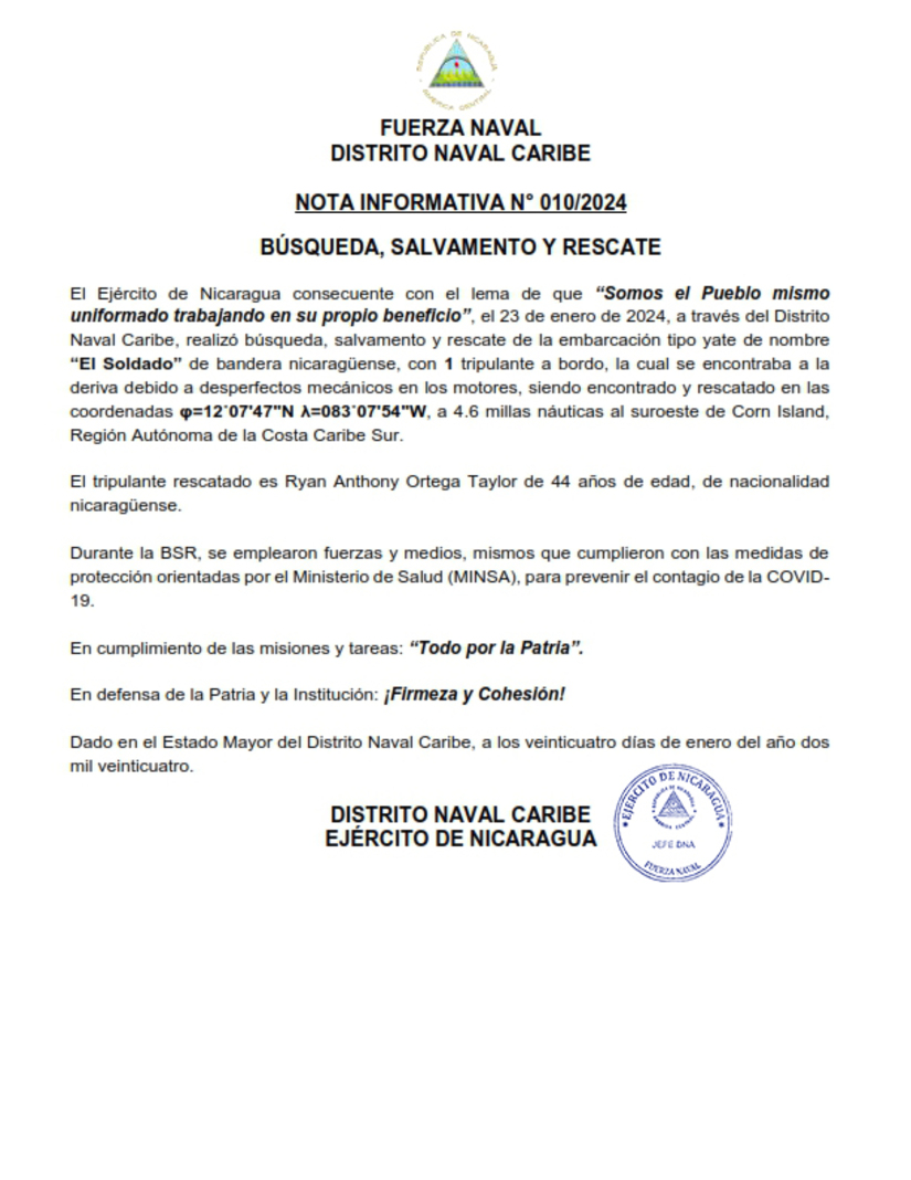 El Ejército de Nicaragua consecuente con el lema de que “Somos el Pueblo mismo uniformado trabajando en su propio beneficio”, el 23 de enero de 2024, a través del Distrito Naval Caribe, realizó búsqueda, salvamento y rescate de la embarcación tipo yate de nombre “El Soldado” de bandera nicaragüense, con 1 tripulante a bordo, la cual se encontraba a la deriva debido a desperfectos mecánicos en los motores, siendo encontrado y rescatado en las coordenadas φ=12˚07'47"N λ=083˚07'54"W, a 4.6 millas náuticas al suroeste de Corn Island, Región Autónoma de la Costa Caribe Sur.