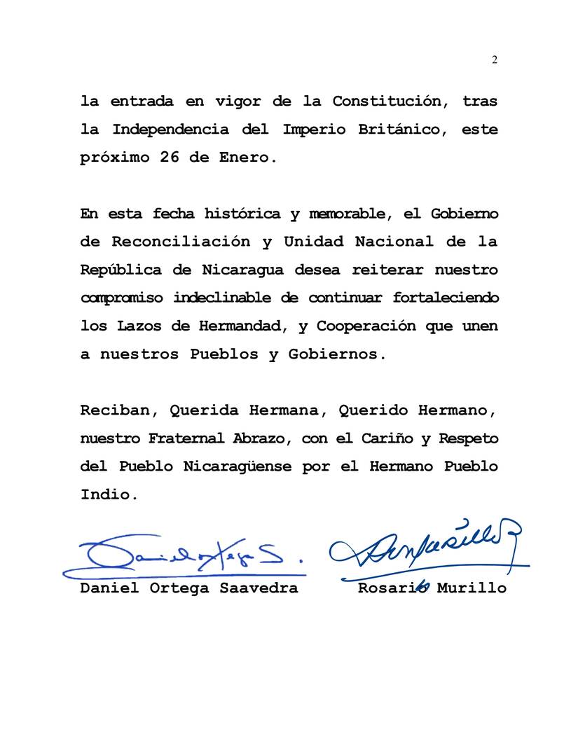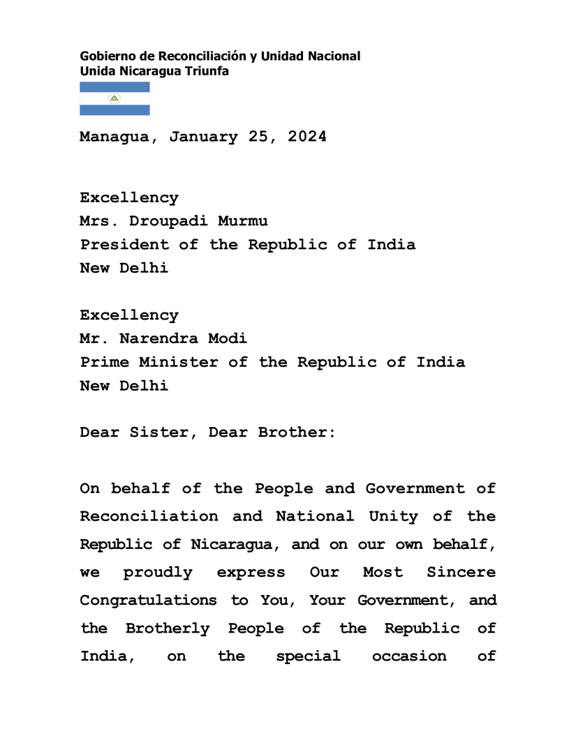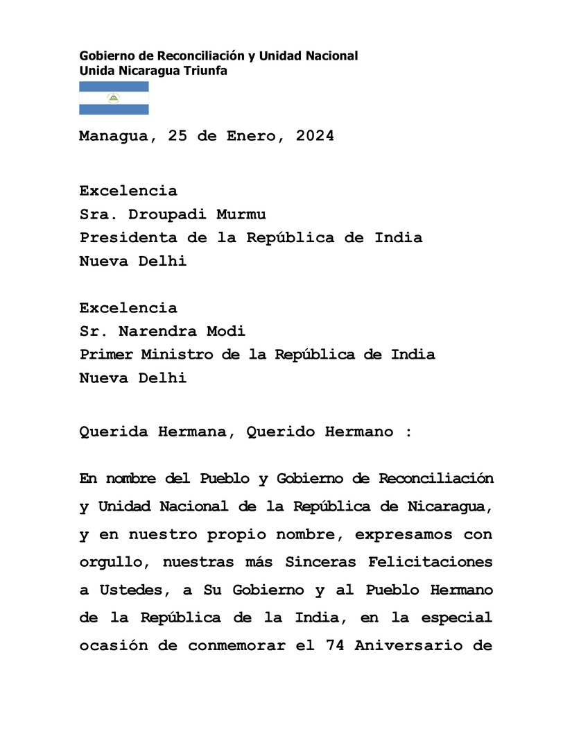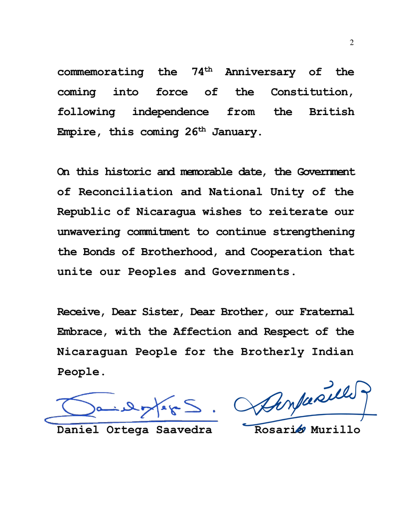 En nombre del Pueblo y Gobierno de Reconciliación y Unidad Nacional de la República de Nicaragua, y en nuestro propio nombre, expresamos con orgullo, nuestras más Sinceras Felicitaciones a Ustedes, a Su Gobierno y al Pueblo Hermano de la República de la India, en la especial ocasión de conmemorar el 74 Aniversario de la entrada en vigor de la Constitución, tras la Independencia del Imperio Británico, este próximo 26 de Enero.