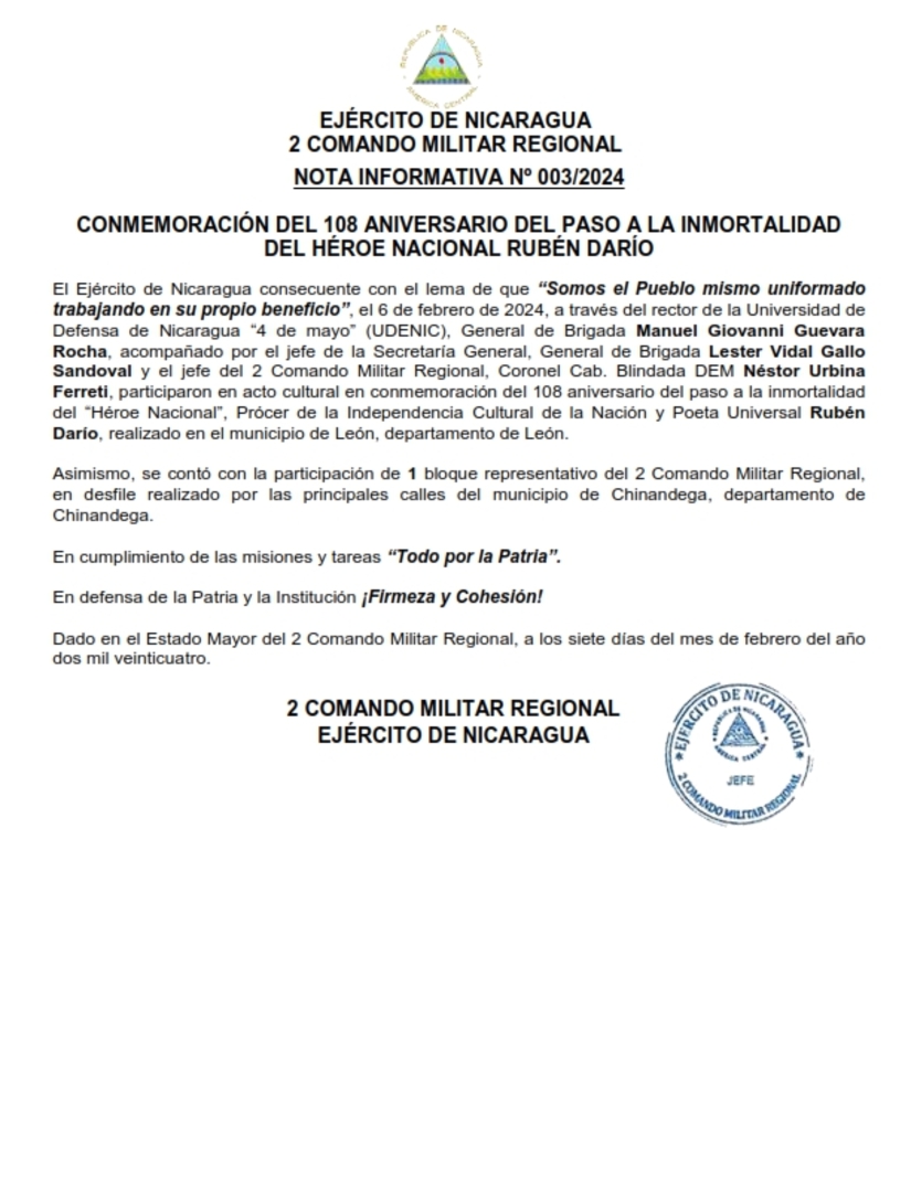El Ejército de Nicaragua consecuente con el lema de que “Somos el Pueblo mismo uniformado trabajando en su propio beneficio”, el 6 de febrero de 2024, a través del rector de la Universidad de Defensa de Nicaragua “4 de mayo” (UDENIC), General de Brigada Manuel Giovanni Guevara Rocha, acompañado por el jefe de la Secretaría General, General de Brigada Lester Vidal Gallo Sandoval y el jefe del 2 Comando Militar Regional, Coronel Cab. Blindada DEM Néstor Urbina Ferreti, participaron en acto cultural en conmemoración del 108 aniversario del paso a la inmortalidad del “Héroe Nacional”, Prócer de la Independencia Cultural de la Nación y Poeta Universal Rubén Darío, realizado en el municipio de León, departamento de León.
