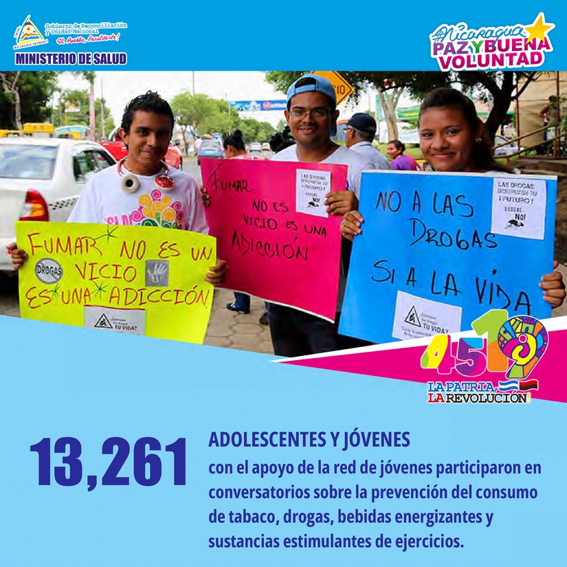 • 13,261 adolescentes y jóvenes, con apoyo de la red de jóvenes, participaron en conversatorios sobre la prevención del consumo de tabaco, drogas, bebidas energizantes y sustancias estimulantes de ejercicios.