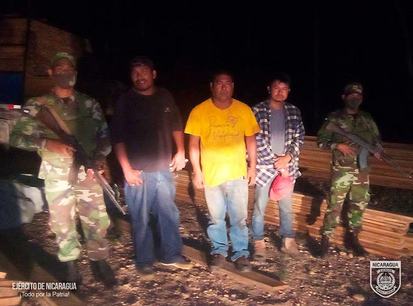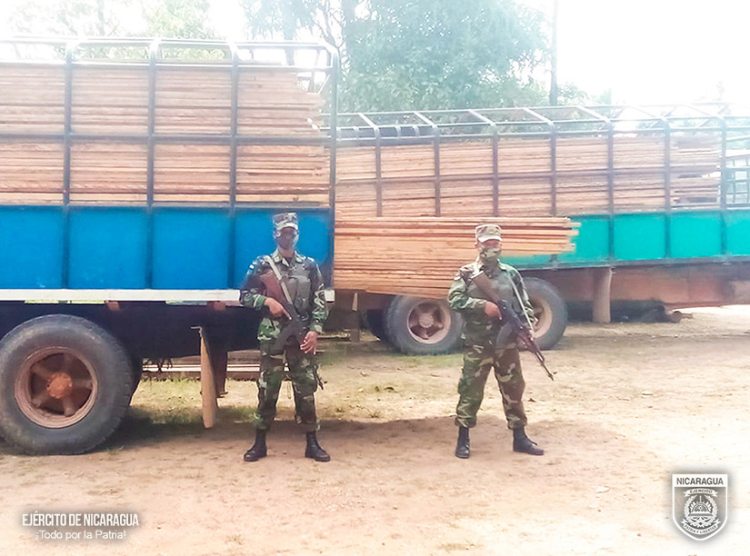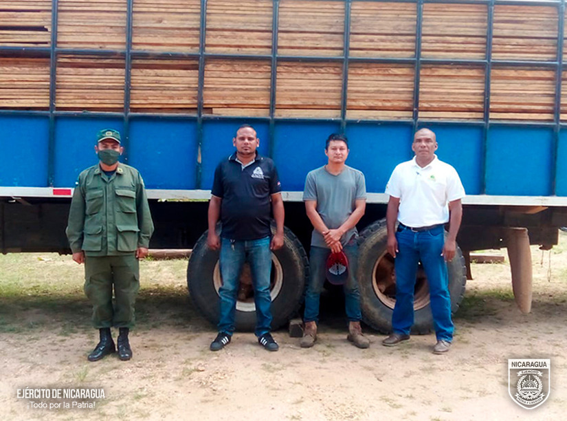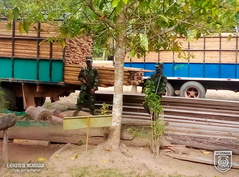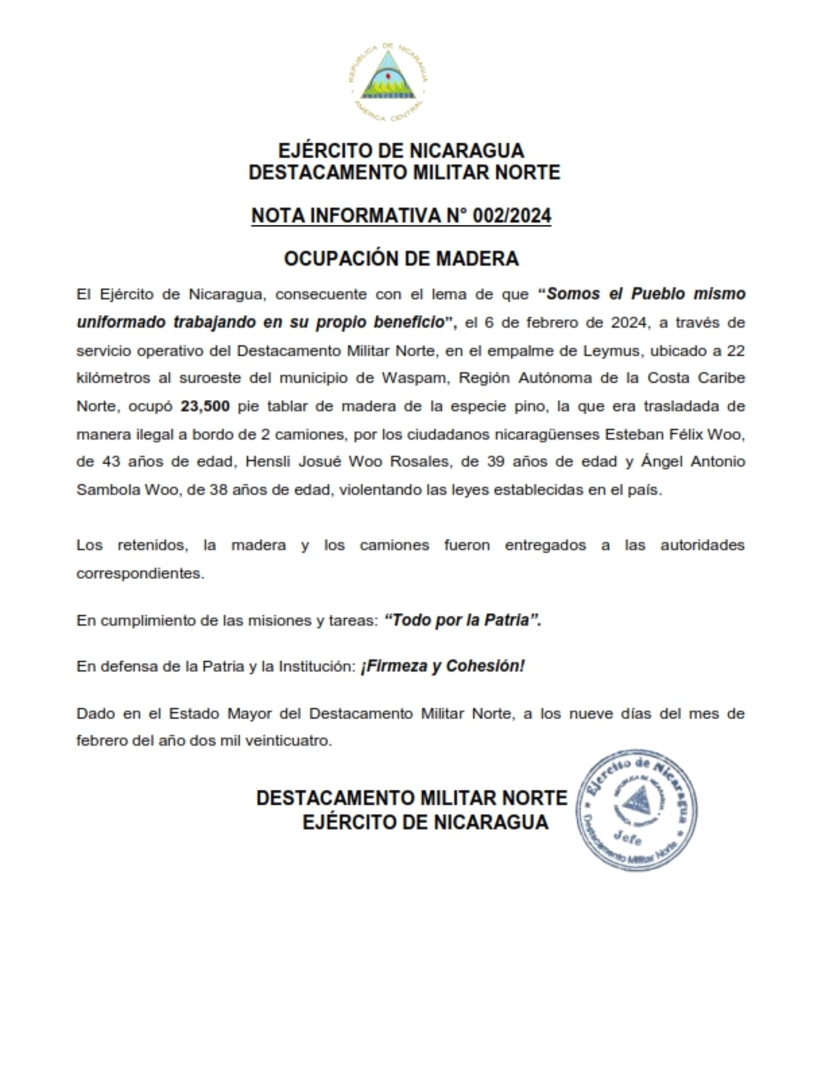 El Ejército de Nicaragua, consecuente con el lema de que “Somos el Pueblo mismo uniformado trabajando en su propio beneficio”, el 6 de febrero de 2024, a través de servicio operativo del Destacamento Militar Norte, en el empalme de Leymus, ubicado a 22 kilómetros al suroeste del municipio de Waspam, Región Autónoma de la Costa Caribe Norte, ocupó 23,500 pie tablar de madera de la especie pino, la que era trasladada de manera ilegal a bordo de 2 camiones, por los ciudadanos nicaragüenses Esteban Félix Woo, de 43 años de edad, Hensli Josué Woo Rosales, de 39 años de edad y Ángel Antonio Sambola Woo, de 38 años de edad, violentando las leyes establecidas en el país.