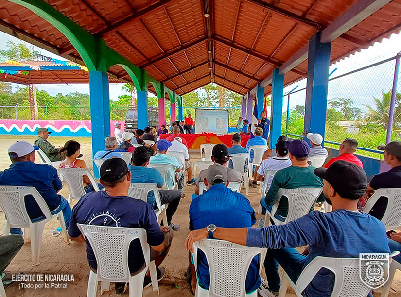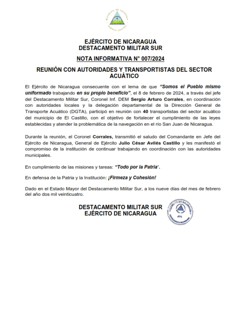 El Ejército de Nicaragua consecuente con el lema de que “Somos el Pueblo mismo uniformado trabajando en su propio beneficio”, el 8 de febrero de 2024, a través del jefe del Destacamento Militar Sur, Coronel Inf. DEM Sergio Arturo Corrales, en coordinación con autoridades locales y la delegación departamental de la Dirección General de Transporte Acuático (DGTA), participó en reunión con 40 transportistas del sector acuático del municipio de El Castillo, con el objetivo de fortalecer el cumplimiento de las leyes establecidas y atender la problemática de la navegación en el río San Juan de Nicaragua.