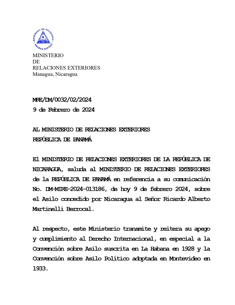 El MINISTERIO DE RELACIONES EXTERIORES DE LA REPÚBLICA DE NICARAGUA, saluda al MINISTERIO DE RELACIONES EXTERIORES de la REPÚBLICA DE PANAMÁ en referencia a su comunicación No. DM-MIRE-2024-013186, de hoy 9 de febrero 2024, sobre el Asilo concedido por Nicaragua al Señor Ricardo Alberto Martinelli Berrocal.