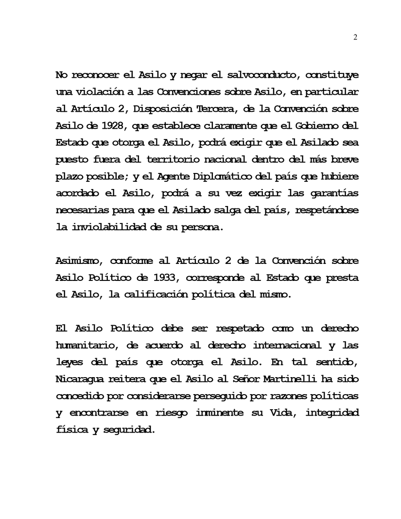 El Asilo Político debe ser respetado como un derecho humanitario, de acuerdo al derecho internacional y las leyes del país que otorga el Asilo. En tal sentido, Nicaragua reitera que el Asilo al Señor Martinelli ha sido concedido por considerarse perseguido por razones políticas y encontrarse en riesgo inminente su Vida, integridad física y seguridad.