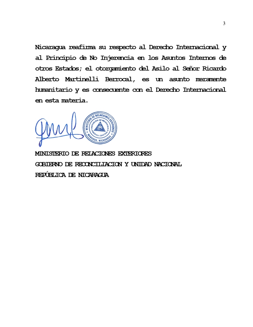 Nicaragua reafirma su respecto al Derecho Internacional y al Principio de No Injerencia en los Asuntos Internos de otros Estados; el otorgamiento del Asilo al Señor Ricardo Alberto Martinelli Berrocal, es un asunto meramente humanitario y es consecuente con el Derecho Internacional en esta materia.