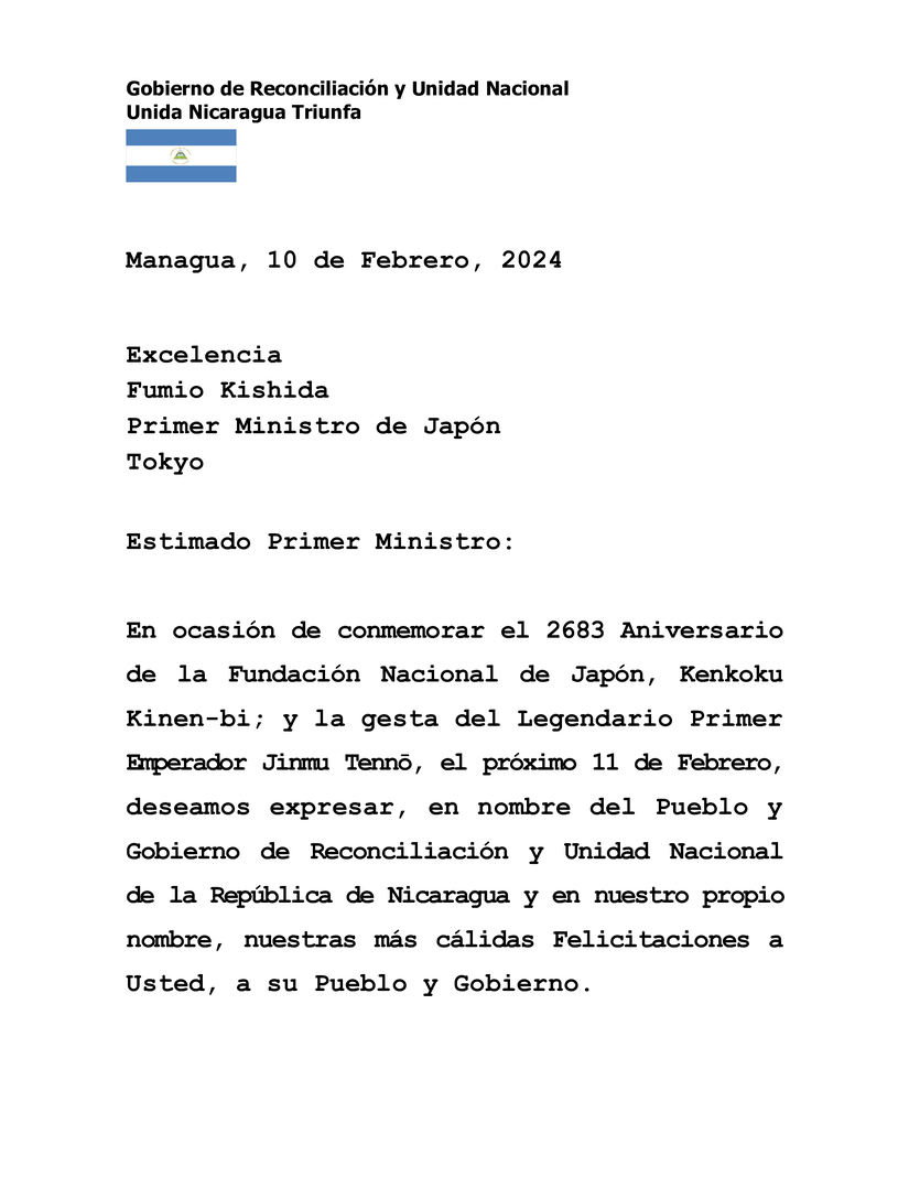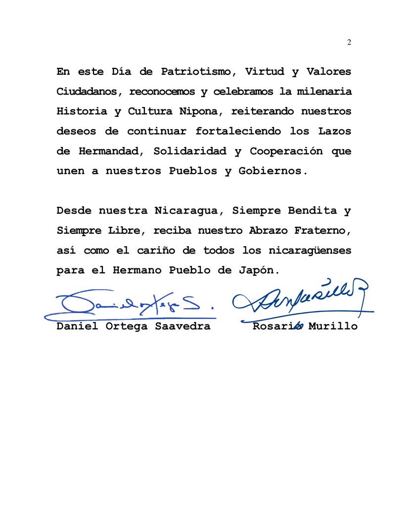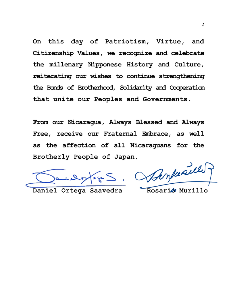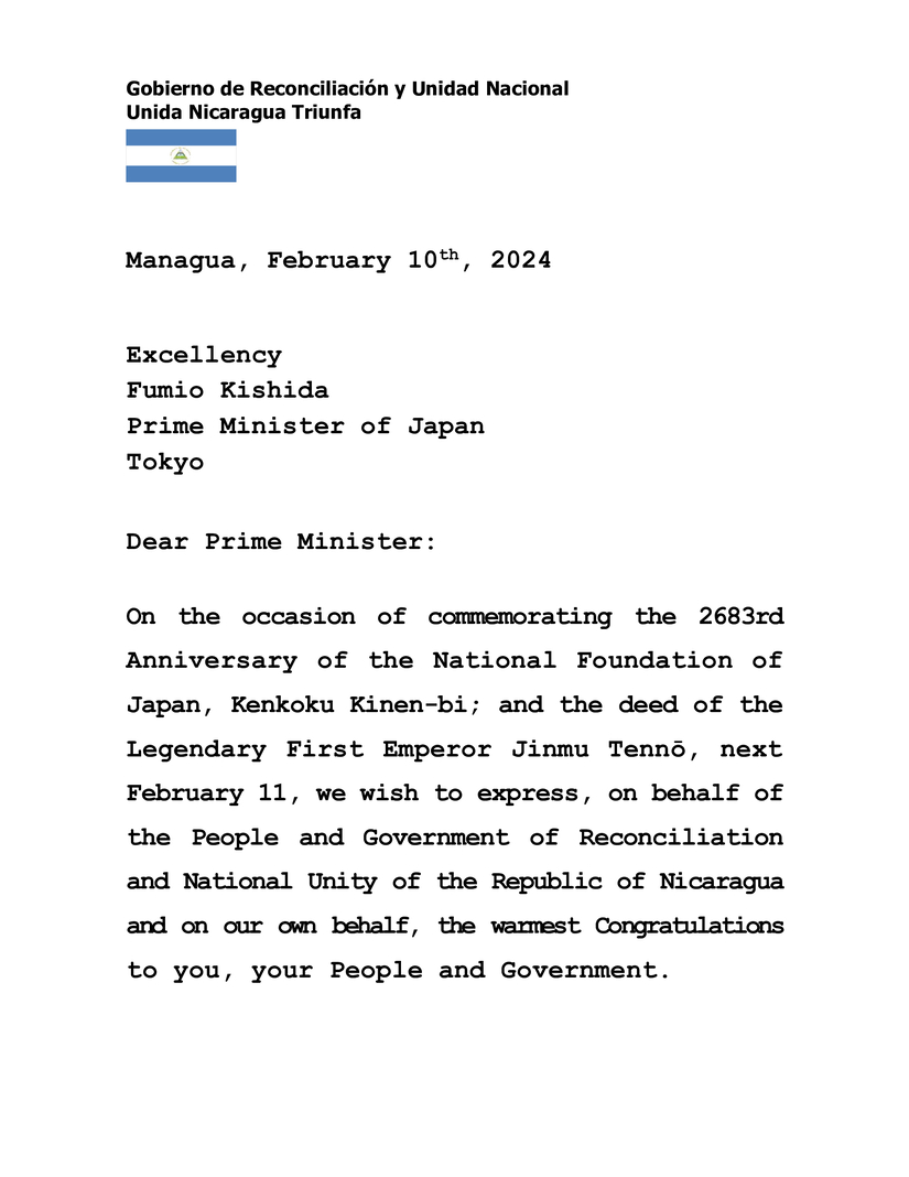 En ocasión de conmemorar el 2683 Aniversario de la Fundación Nacional de Japón, Kenkoku Kinen-bi; y la gesta del Legendario Primer Emperador Jinmu Tennō, el próximo 11 de Febrero, deseamos expresar, en nombre del Pueblo y Gobierno de Reconciliación y Unidad Nacional de la República de Nicaragua y en nuestro propio nombre, nuestras más cálidas Felicitaciones a Usted, a su Pueblo y Gobierno.
