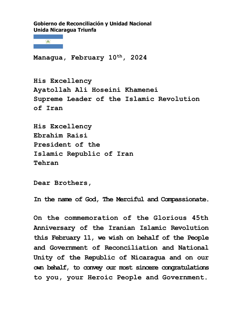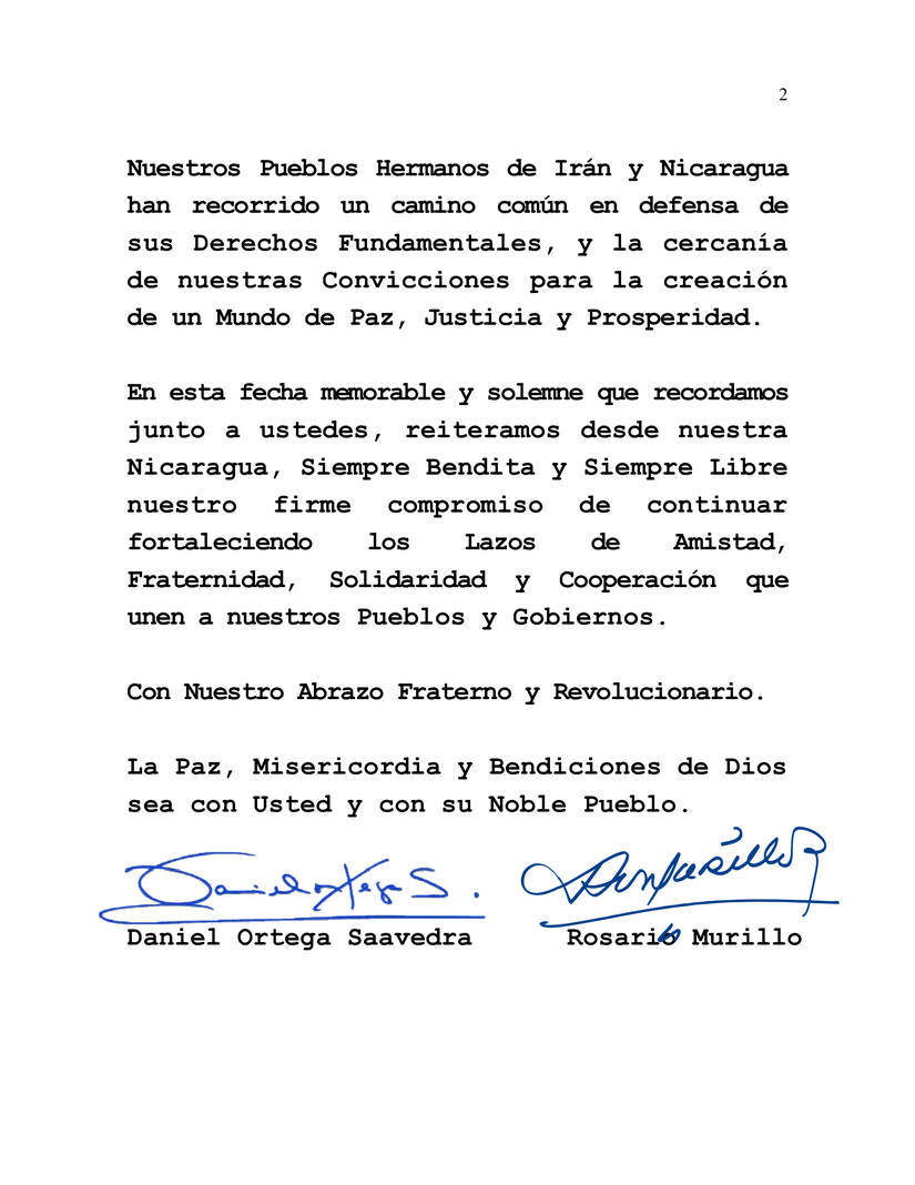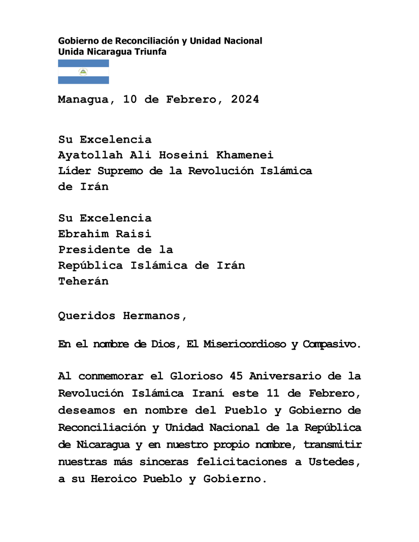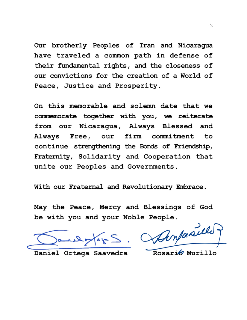 Al conmemorar el Glorioso 45 Aniversario de la Revolución Islámica Iraní este 11 de Febrero, deseamos en nombre del Pueblo y Gobierno de Reconciliación y Unidad Nacional de la República de Nicaragua y en nuestro propio nombre, transmitir nuestras más sinceras felicitaciones a Ustedes, a su Heroico Pueblo y Gobierno.