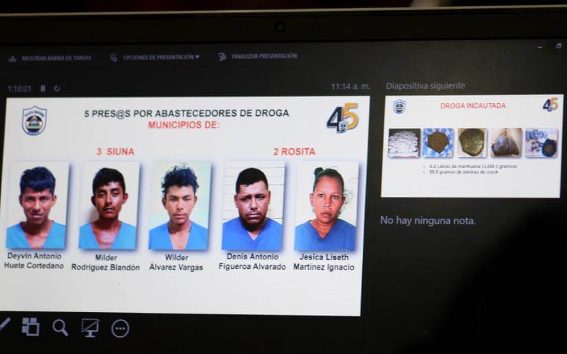 “Preso por tráfico de drogas en el municipio de Estelí el sujeto Mauricio Antonio Méndez Arteta. Evidencias ocupadas fueron 2 libras de marihuana y una motocicleta; 4 presos por abastecedores de droga en los distritos de Managua, a quienes se les ocupó un kilo con 411 gramos de cocaína, 2 libras con 35 gramos de marihuana, un automóvil, una motocicleta y dinero producto de la venta de droga”, detalló.