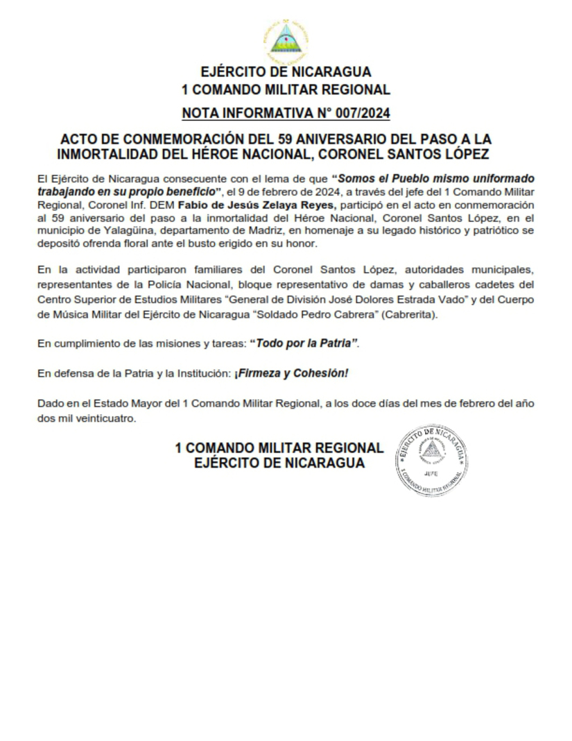 El Ejército de Nicaragua consecuente con el lema de que “Somos el Pueblo mismo uniformado trabajando en su propio beneficio”, el 9 de febrero de 2024, a través del jefe del 1 Comando Militar Regional, Coronel Inf. DEM Fabio de Jesús Zelaya Reyes, participó en el acto en conmemoración al 59 aniversario del paso a la inmortalidad del Héroe Nacional, Coronel Santos López, en el municipio de Yalagüina, departamento de Madriz, en homenaje a su legado histórico y patriótico se depositó ofrenda floral ante el busto erigido en su honor.