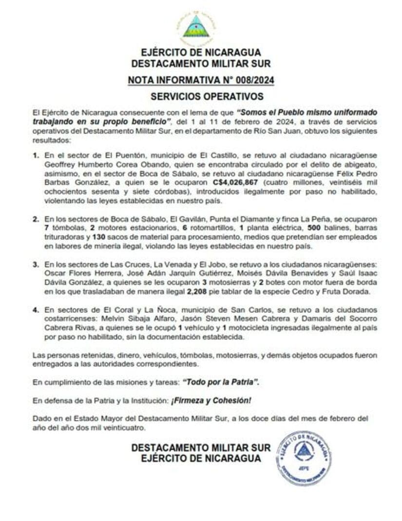 El Ejército de Nicaragua consecuente con el lema de que “Somos el Pueblo mismo uniformado trabajando en su propio beneficio”, del 1 al 11 de febrero de 2024, a través de servicios operativos del Destacamento Militar Sur, en el departamento de Río San Juan, obtuvo los siguientes resultados: