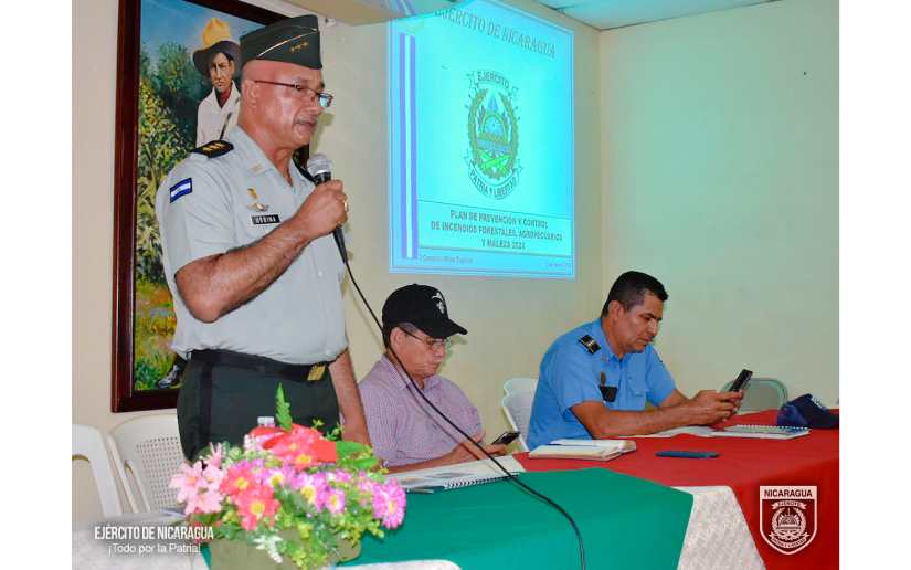 El Ejército de Nicaragua consecuente con el lema de que “Somos el Pueblo mismo uniformado trabajando en su propio beneficio”, el 12 de febrero de 2024, a través del jefe del 2 Comando Militar Regional, Coronel Cab. Blindada DEM, Néstor Urbina Ferreti, en coordinación con Instituciones del Estado, participó en la exposición del Plan Departamental Interinstitucional de Prevención y Control de Incendios Forestales, Agropecuarios y Maleza 2024, del departamento de León.