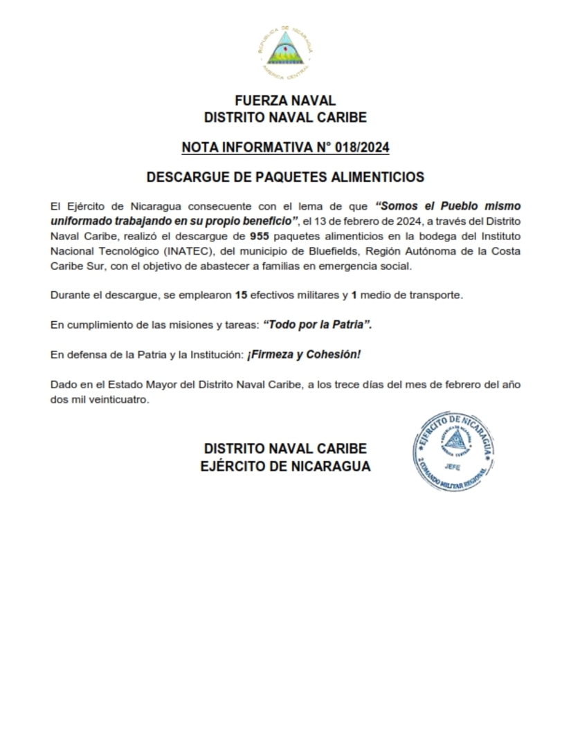 El Ejército de Nicaragua consecuente con el lema de que “Somos el Pueblo mismo uniformado trabajando en su propio beneficio”, el 13 de febrero de 2024, a través del Distrito Naval Caribe, realizó el descargue de 955 paquetes alimenticios en la bodega del Instituto Nacional Tecnológico (INATEC), del municipio de Bluefields, Región Autónoma de la Costa Caribe Sur, con el objetivo de abastecer a familias en emergencia social.