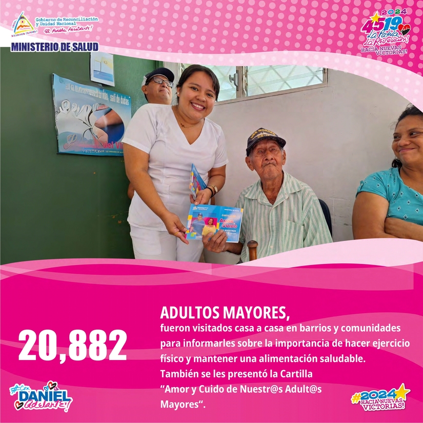 • 20,882 Adult@s Mayores visitados en sus casas en barrios y comunidades para informarles sobre la importancia de hacer ejercicio físico y mantener una alimentación saludable y se les presentó la Cartilla “Amor y Cuido de Nuestros Adultos Mayores”.