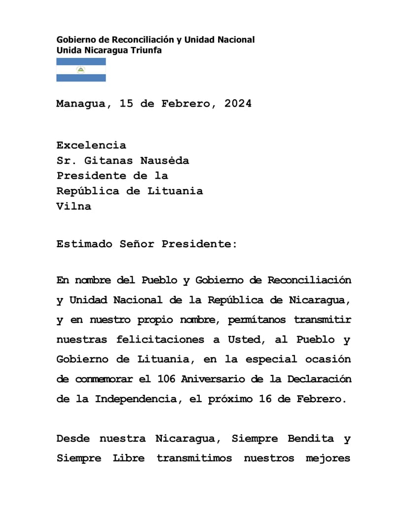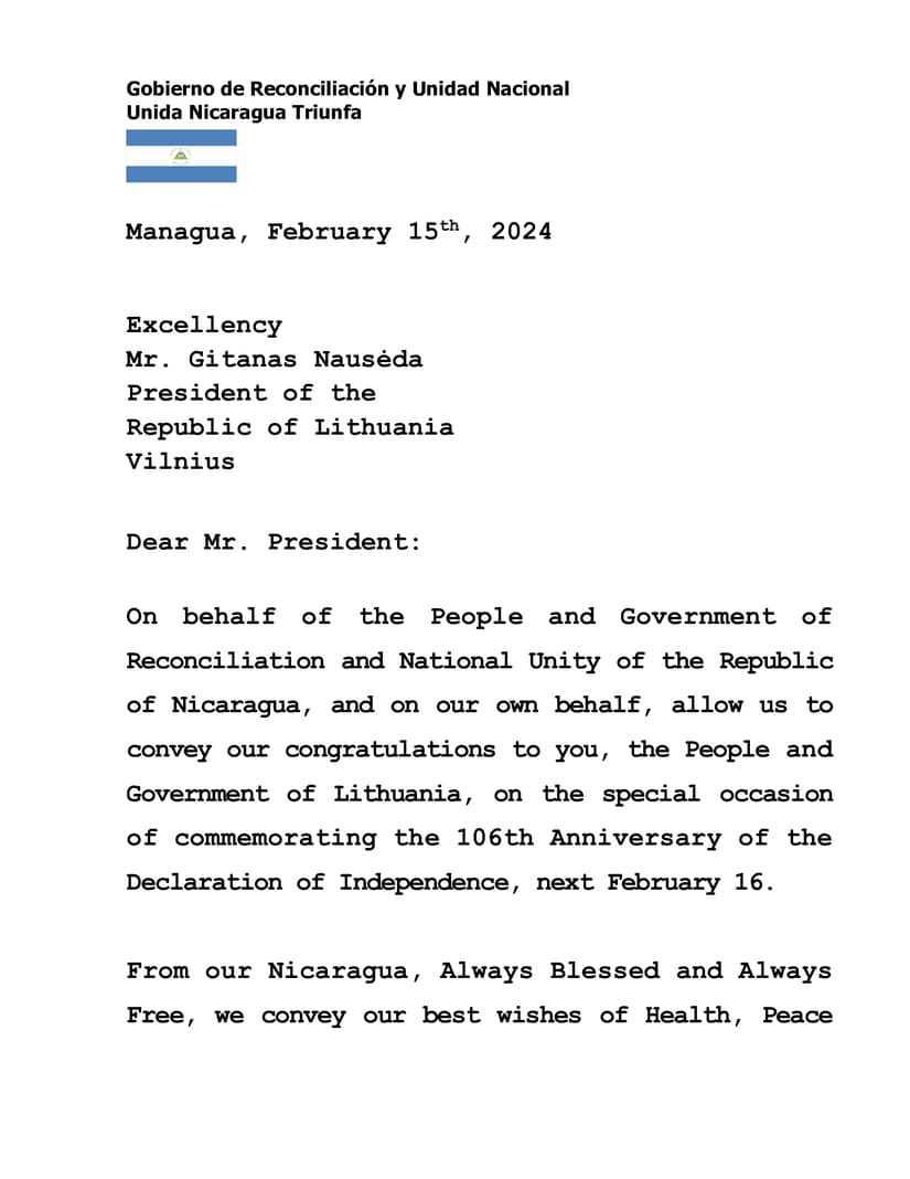 En nombre del Pueblo y Gobierno de Reconciliación y Unidad Nacional de la República de Nicaragua, y en nuestro propio nombre, permítanos transmitir nuestras felicitaciones a Usted, al Pueblo y Gobierno de Lituania, en la especial ocasión de conmemorar el 106 Aniversario de la Declaración de la Independencia, el próximo 16 de Febrero.