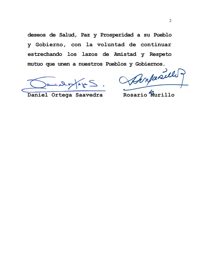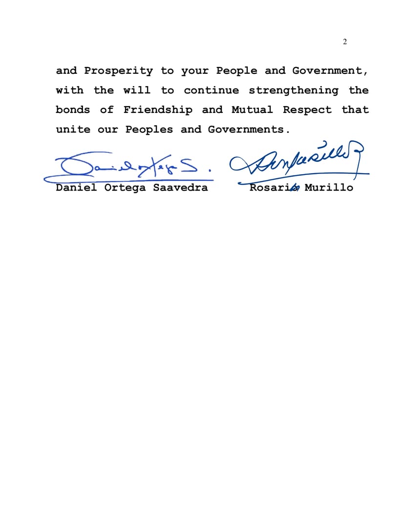 Desde nuestra Nicaragua, Siempre Bendita y Siempre Libre transmitimos nuestros mejores deseos de Salud, Paz y Prosperidad a su Pueblo y Gobierno, con la voluntad de continuar estrechando los lazos de Amistad y Respeto mutuo que unen a nuestros Pueblos y Gobiernos.