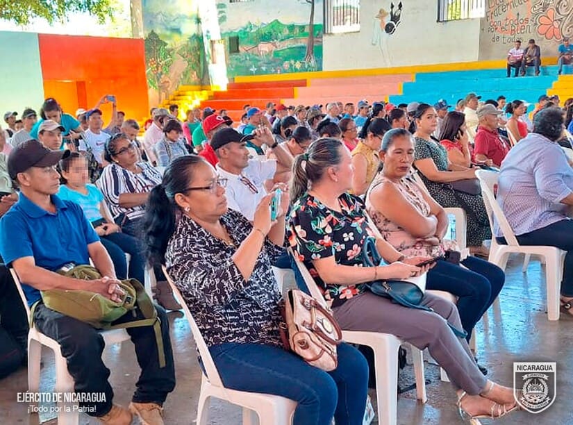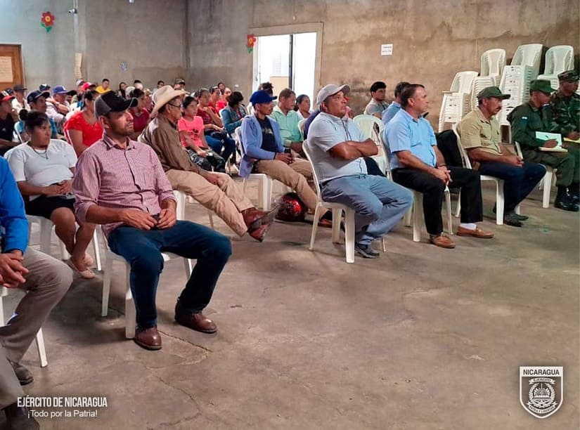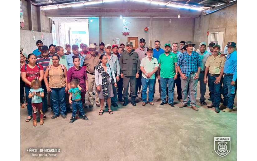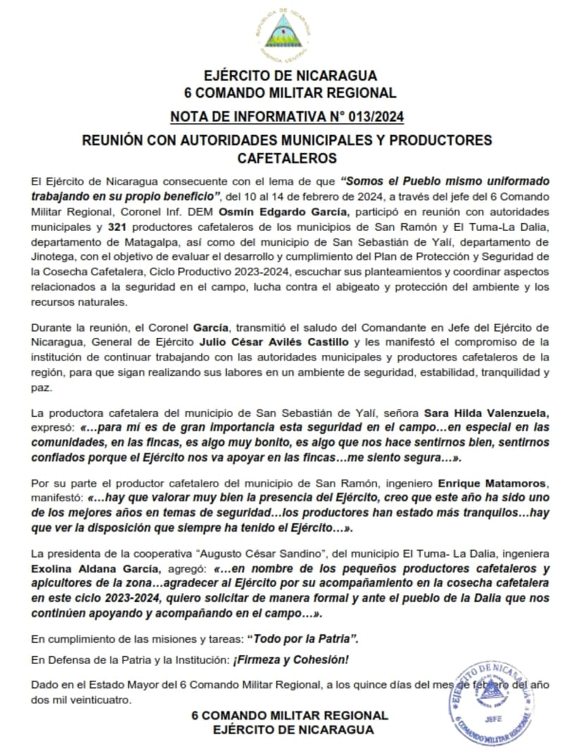 El Ejército de Nicaragua consecuente con el lema de que “Somos el Pueblo mismo uniformado trabajando en su propio beneficio”, del 10 al 14 de febrero de 2024, a través del jefe del 6 Comando Militar Regional, Coronel Inf. DEM Osmín Edgardo García, participó en reunión con autoridades municipales y 321 productores cafetaleros de los municipios de San Ramón y El Tuma-La Dalia, departamento de Matagalpa, así como del municipio de San Sebastián de Yalí, departamento de Jinotega, con el objetivo de evaluar el desarrollo y cumplimiento del Plan de Protección y Seguridad de la Cosecha Cafetalera, Ciclo Productivo 2023-2024, escuchar sus planteamientos y coordinar aspectos relacionados a la seguridad en el campo, lucha contra el abigeato y protección del ambiente y los recursos naturales.