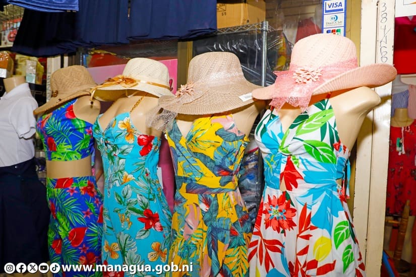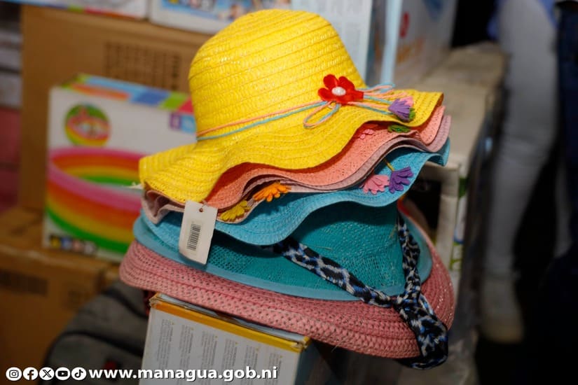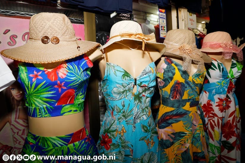 "Tenemos sombreros de niña que se venden bastante para proteger a los pequeños del sol y los precios están muy accesibles porque este sombrerito cuesta 180 córdobas, si quiere un sombrero más grande para una dama lo tenemos a 250 córdobas, las camisetas de varones cuestan 250 córdobas, camisas un poco más finas con temática de playa le cuestan 350 córdobas y los shores de marca Docker cuestan 400 córdobas, así que como pueden ver tenemos buenos precios y aquí los estamos esperando en el mercado Roberto Huembes", comentó Hazel.