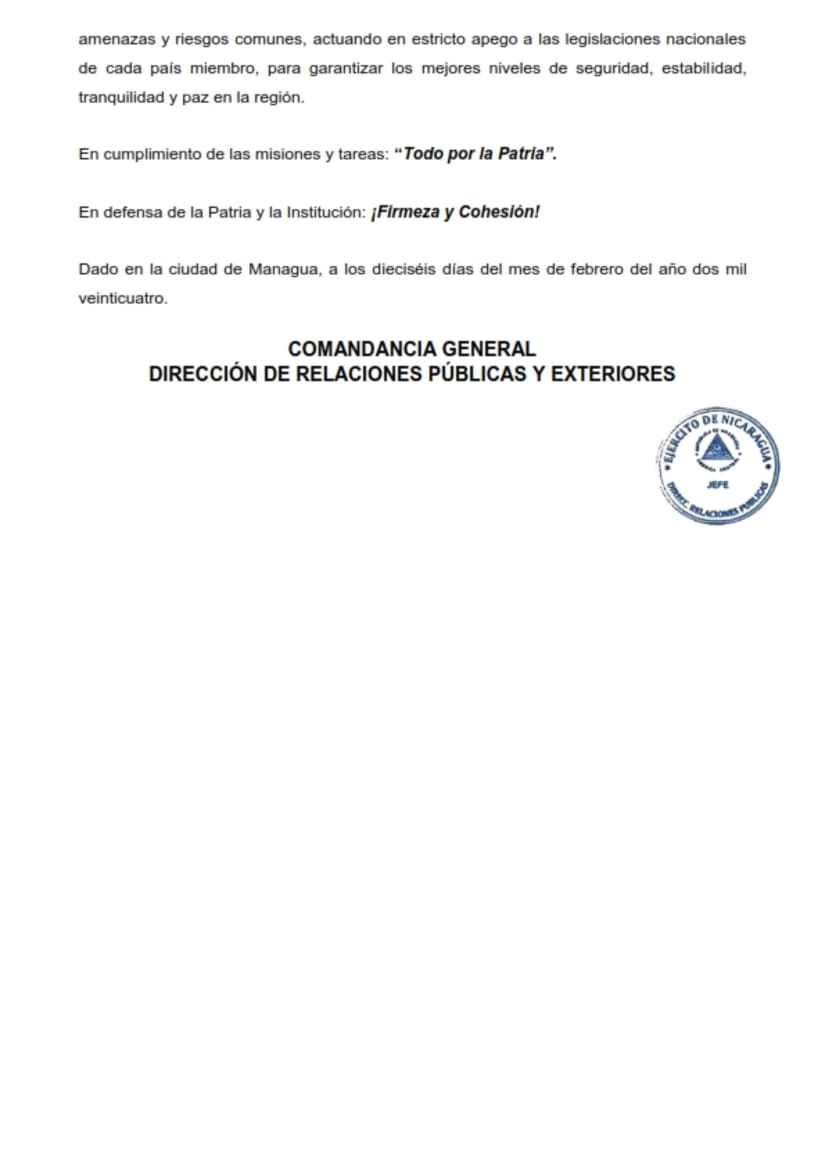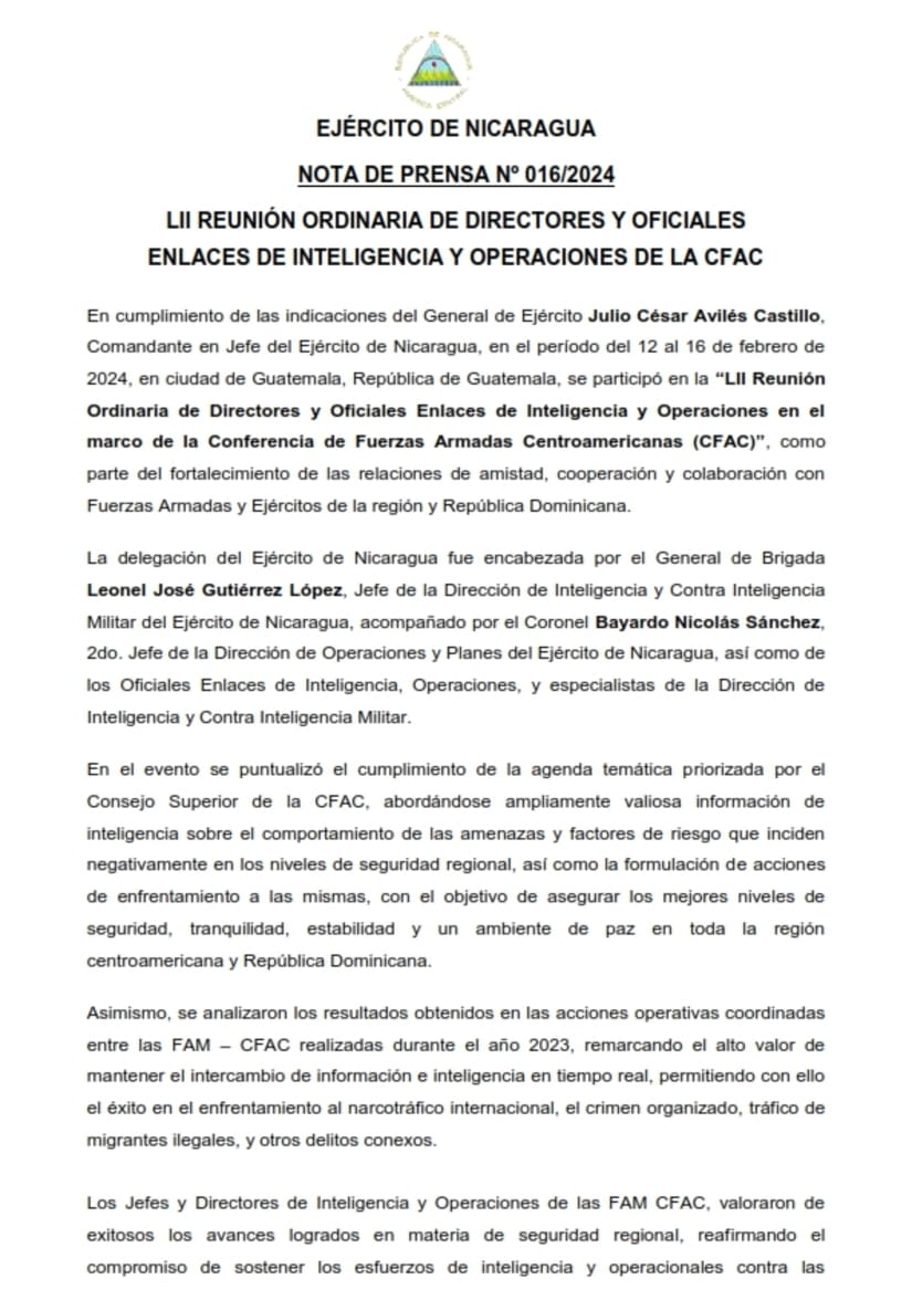En cumplimiento de las indicaciones del General de Ejército Julio César Avilés Castillo, Comandante en Jefe del Ejército de Nicaragua, en el período del 12 al 16 de febrero de 2024, en ciudad de Guatemala, República de Guatemala, se participó en la “LII Reunión Ordinaria de Directores y Oficiales Enlaces de Inteligencia y Operaciones en el marco de la Conferencia de Fuerzas Armadas Centroamericanas (CFAC)”, como parte del fortalecimiento de las relaciones de amistad, cooperación y colaboración con Fuerzas Armadas y Ejércitos de la región y República Dominicana.