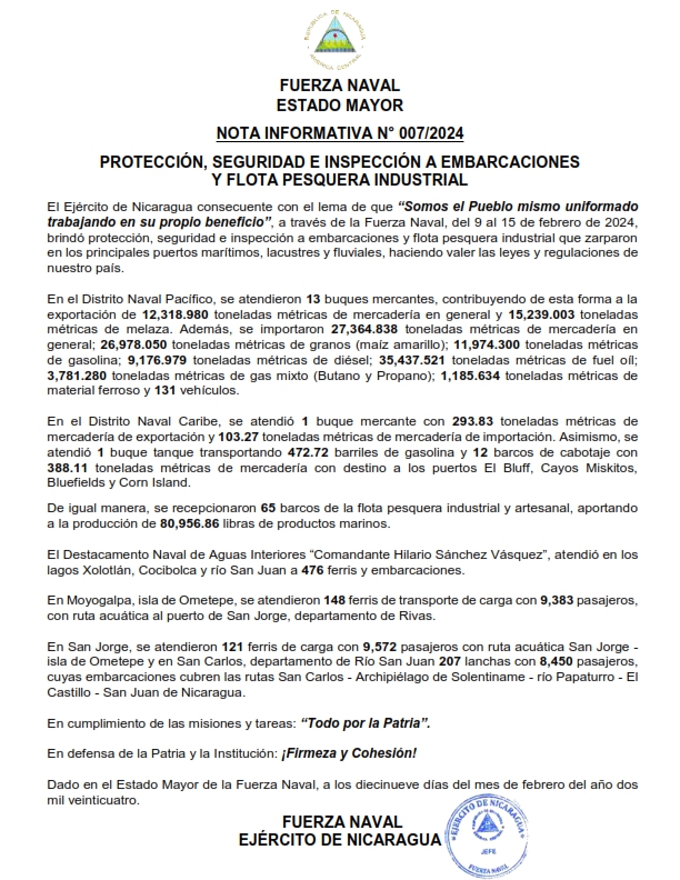 El Ejército de Nicaragua consecuente con el lema de que “Somos el Pueblo mismo uniformado trabajando en su propio beneficio”, a través de la Fuerza Naval, del 9 al 15 de febrero de 2024, brindó protección, seguridad e inspección a embarcaciones y flota pesquera industrial que zarparon en los principales puertos marítimos, lacustres y fluviales, haciendo valer las leyes y regulaciones de nuestro país.