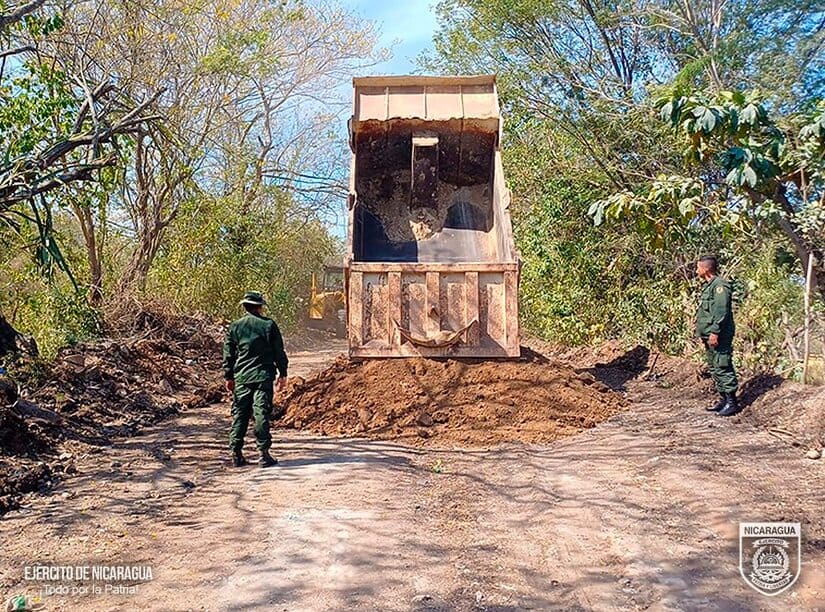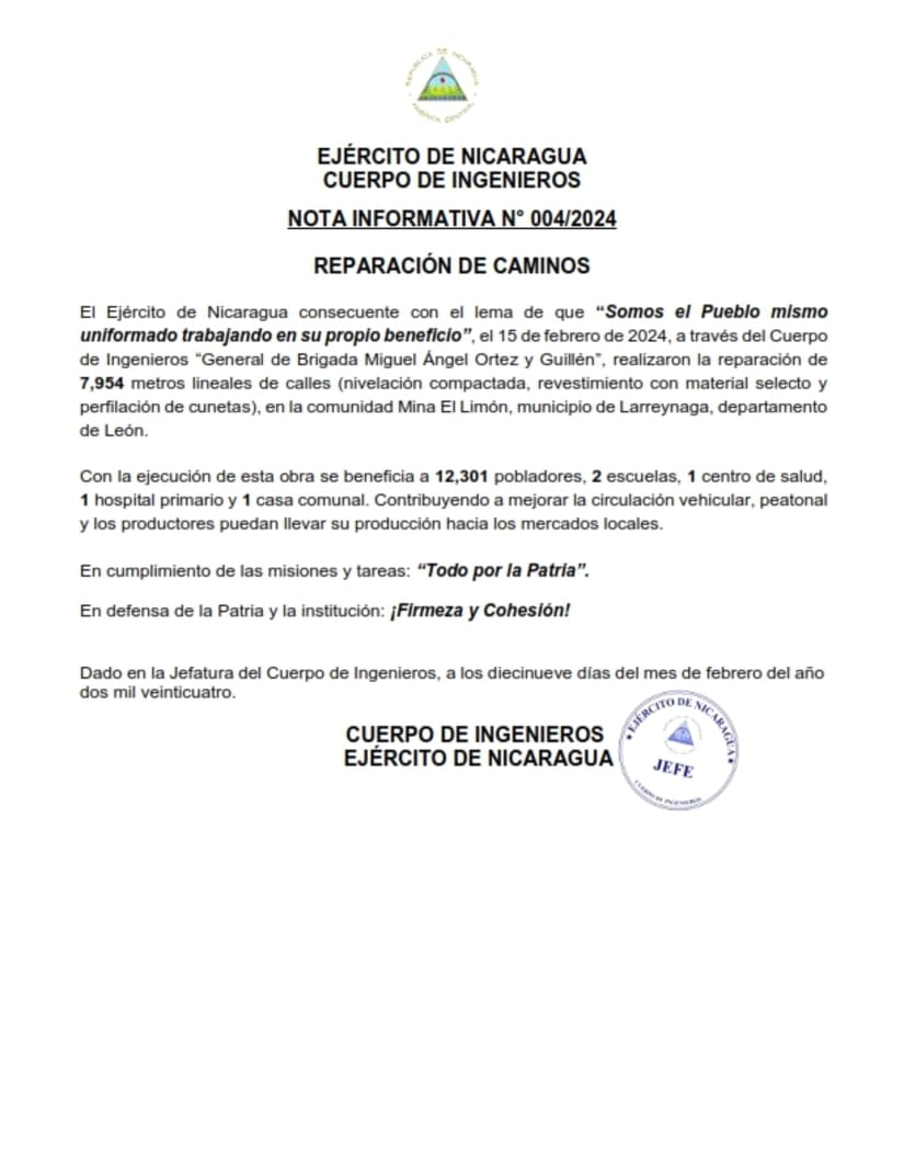 El Ejército de Nicaragua consecuente con el lema de que “Somos el Pueblo mismo uniformado trabajando en su propio beneficio”, el 15 de febrero de 2024, a través del Cuerpo de Ingenieros “General de Brigada Miguel Ángel Ortez y Guillén”, realizaron la reparación de 7,954 metros lineales de calles (nivelación compactada, revestimiento con material selecto y perfilación de cunetas), en la comunidad Mina El Limón, municipio de Larreynaga, departamento de León.