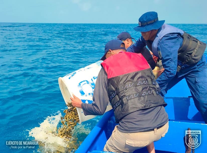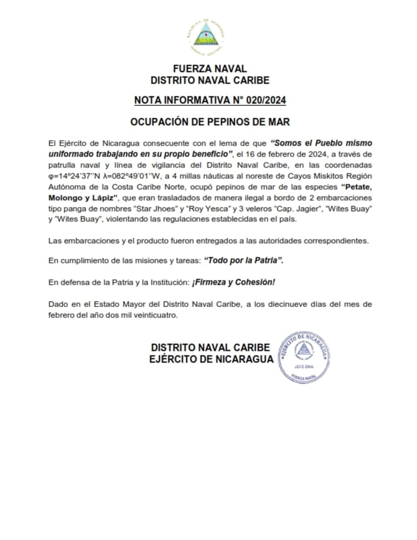 El Ejército de Nicaragua consecuente con el lema de que “Somos el Pueblo mismo uniformado trabajando en su propio beneficio”, el 16 de febrero de 2024, a través de patrulla naval y línea de vigilancia del Distrito Naval Caribe, en las coordenadas φ=14º24’37’’N λ=082º49’01’’W, a 4 millas náuticas al noreste de Cayos Miskitos Región Autónoma de la Costa Caribe Norte, ocupó pepinos de mar de las especies “Petate, Molongo y Lápiz”, que eran trasladados de manera ilegal a bordo de 2 embarcaciones tipo panga de nombres “Star Jhoes” y “Roy Yesca” y 3 veleros “Cap. Jagier”, “Wites Buay” y “Wites Buay”, violentando las regulaciones establecidas en el país.