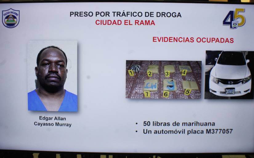 “A él le ocupamos 50 libras de marihuana, un automóvil placa M377057, también por tráfico de droga, en la ciudad de El Rama fue capturado Sheynon José Bonilla Bennett, a quien le incautamos 5 libras de marihuana”, dijo el comisionado general.