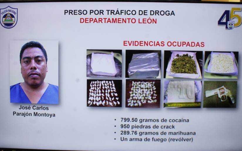 “Por tráfico de drogas, esta vez en el departamento de León se detuvo al sujeto José Carlos Parajón Montoya, a quien le ocuparon 779.5 gramos de cocaína, 950 piedras de crack, 289.7 gramos de marihuana y un arma de fuego”, señaló.