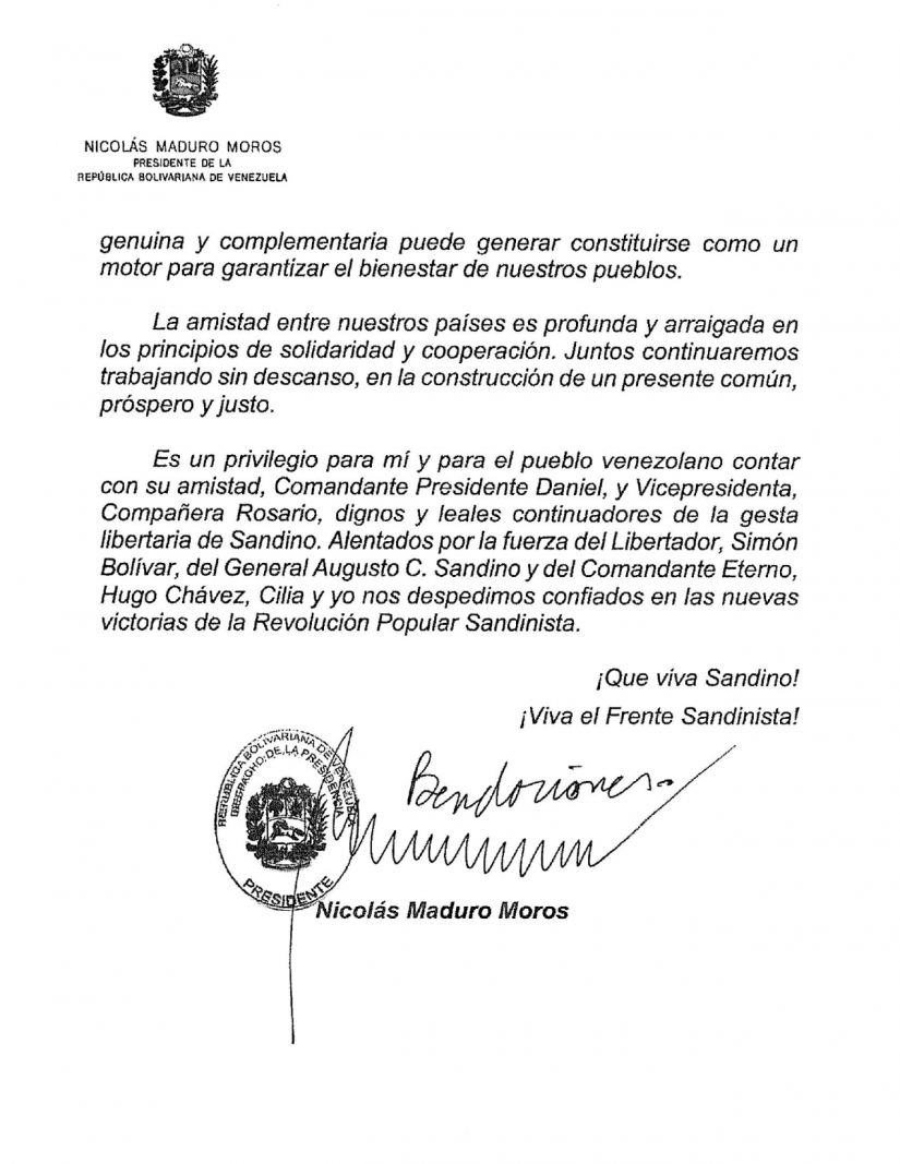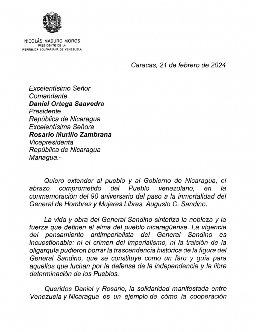 Hemos recibido y remitimos Mensaje del Compañero Nicolás Maduro Moros, Presidente Constitucional de la República Bolivariana de Venezuela, a nuestro Pueblo y Gobierno, en ocasión del 90 Aniversario del Tránsito a la Inmortalidad del General de Hombres y Mujeres Libres, Augusto C. Sandino.