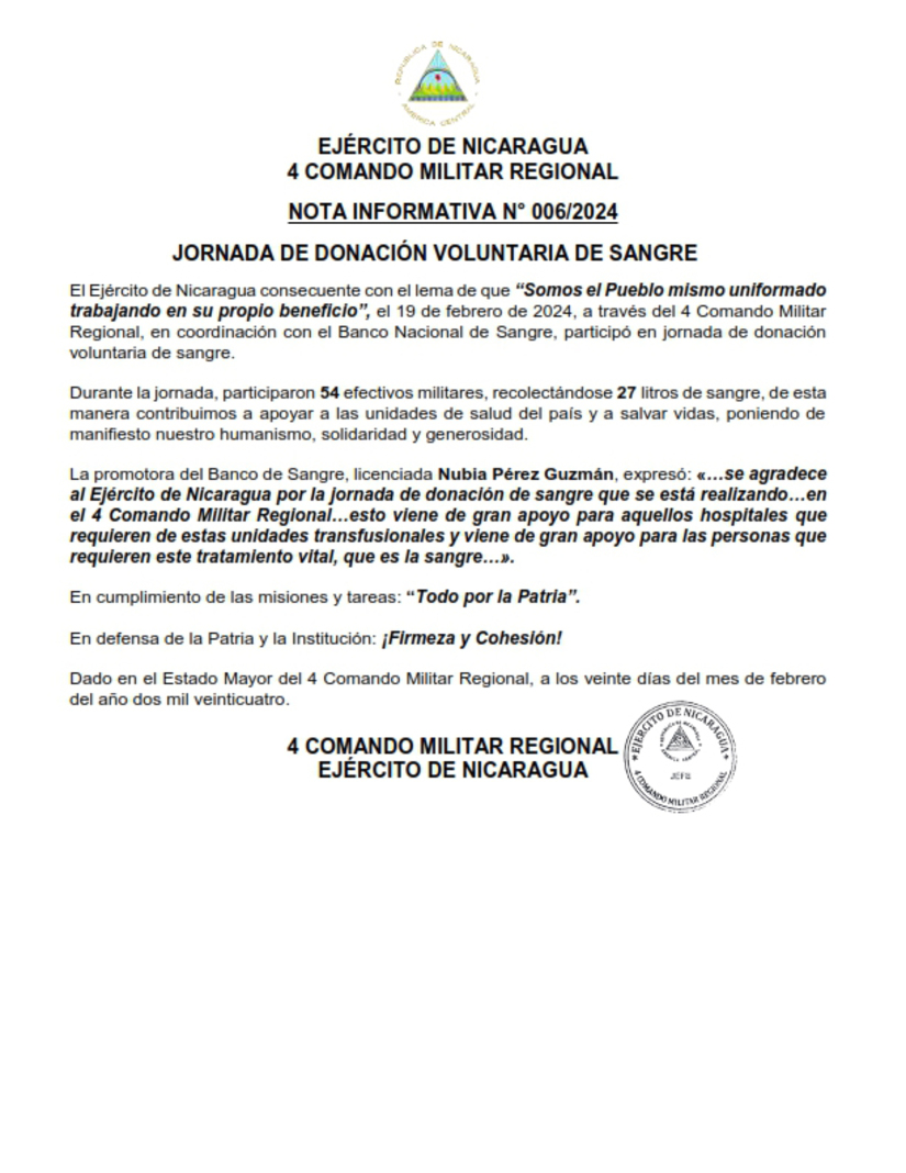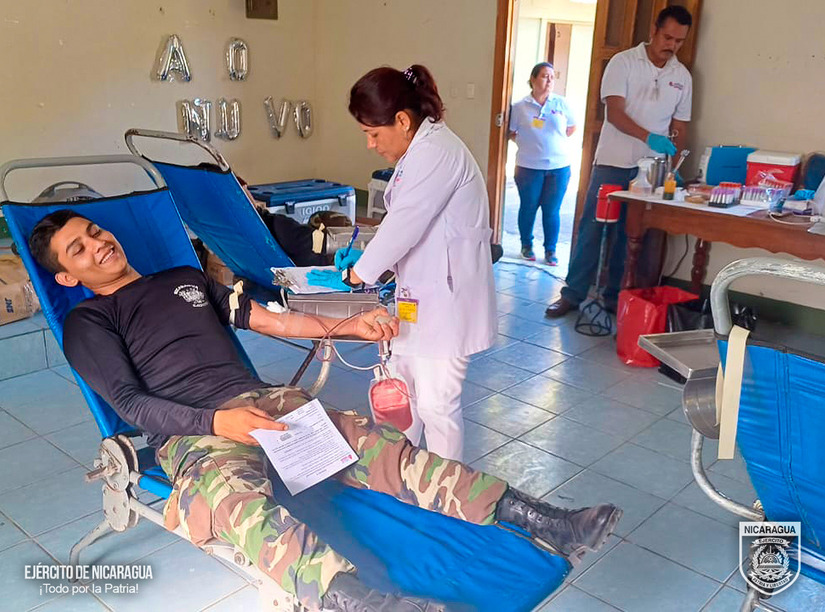 El Ejército de Nicaragua consecuente con el lema de que “Somos el Pueblo mismo uniformado trabajando en su propio beneficio”, el 19 de febrero de 2024, a través del 4 Comando Militar Regional, en coordinación con el Banco Nacional de Sangre, participó en jornada de donación voluntaria de sangre.
