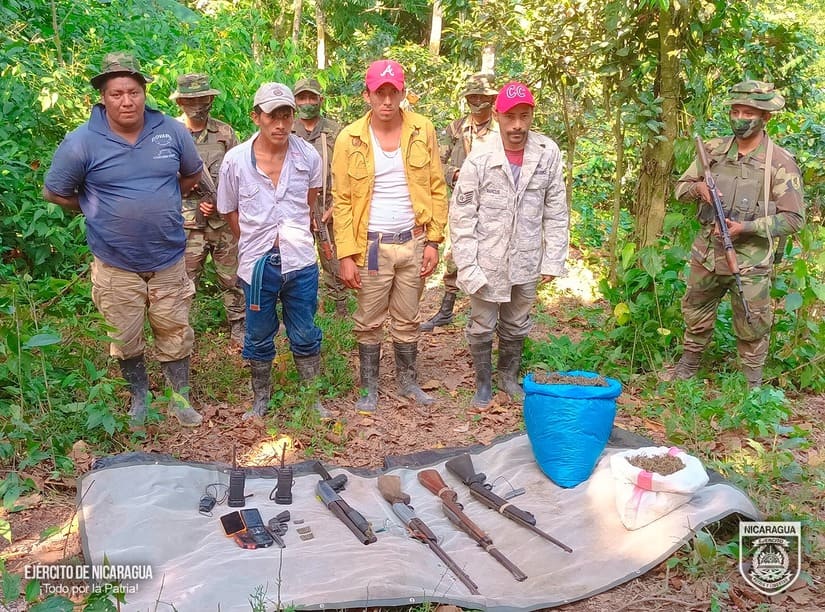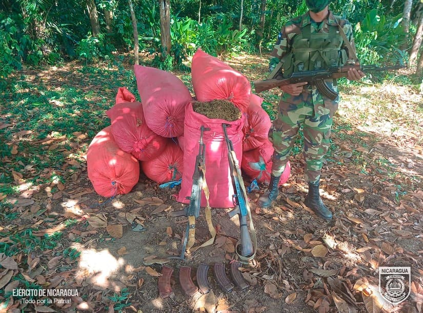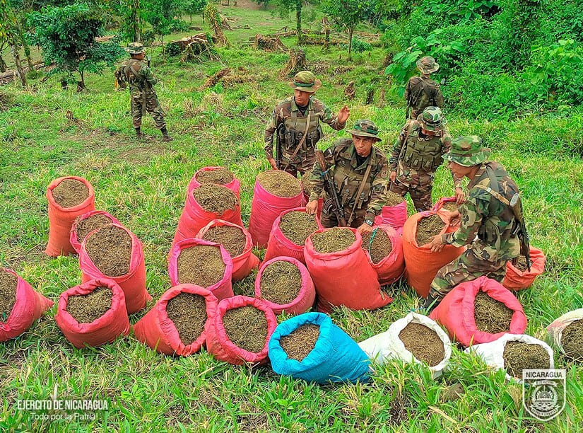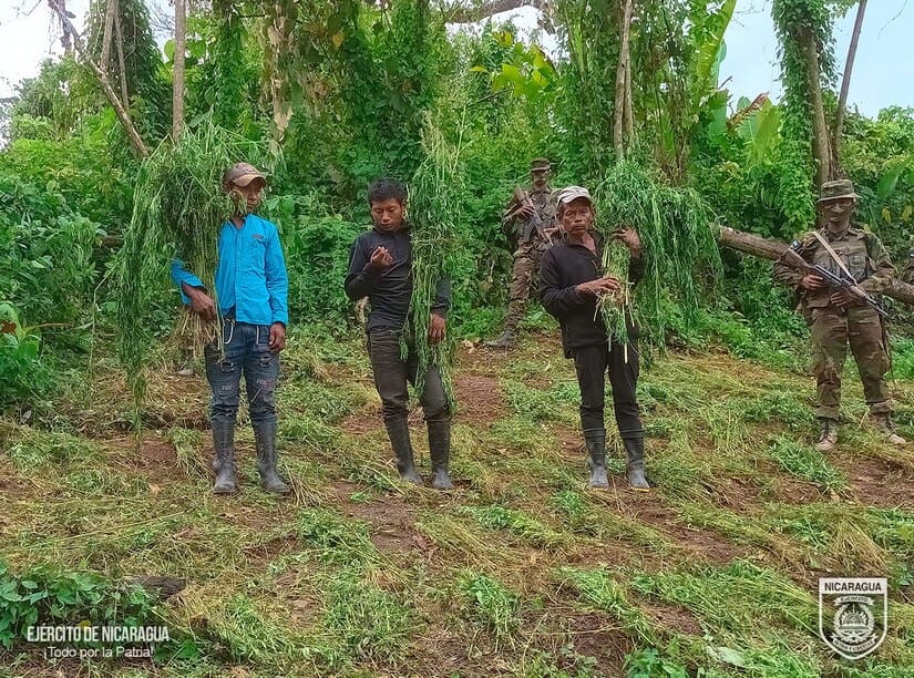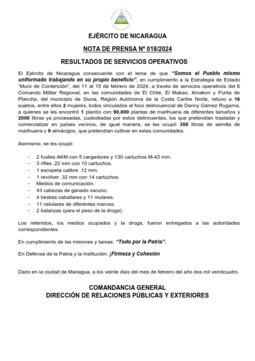 El Ejército de Nicaragua consecuente con el lema de que “Somos el Pueblo mismo uniformado trabajando en su propio beneficio”, en cumplimiento a la Estrategia de Estado “Muro de Contención”, del 11 al 15 de febrero de 2024, a través de servicios operativos del 6 Comando Militar Regional, en las comunidades de El Chile, El Makao, Amakon y Punta de Plancha, del municipio de Siuna, Región Autónoma de la Costa Caribe Norte, retuvo a 16 sujetos, entre ellos 2 mujeres, todos vinculados al foco delincuencial de Danny Gámez Rugama, a quienes se les encontró 1 plantío con 90,000 plantas de marihuana de diferentes tamaños y 2000 libras ya procesadas, custodiadas por estos delincuentes, los que pretendían trasladar y comercializar en países vecinos, de igual manera, se les ocupó 300 libras de semilla de marihuana y 9 almácigos, que pretendían cultivar en estas comunidades.
