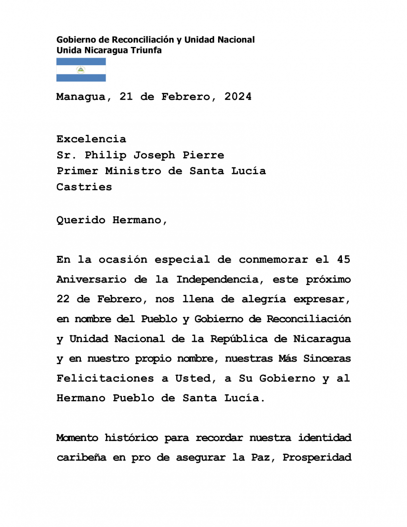 En la ocasión especial de conmemorar el 45 Aniversario de la Independencia, este próximo 22 de Febrero, nos llena de alegría expresar, en nombre del Pueblo y Gobierno de Reconciliación y Unidad Nacional de la República de Nicaragua y en nuestro propio nombre, nuestras Más Sinceras Felicitaciones a Usted, a Su Gobierno y al Hermano Pueblo de Santa Lucía.
