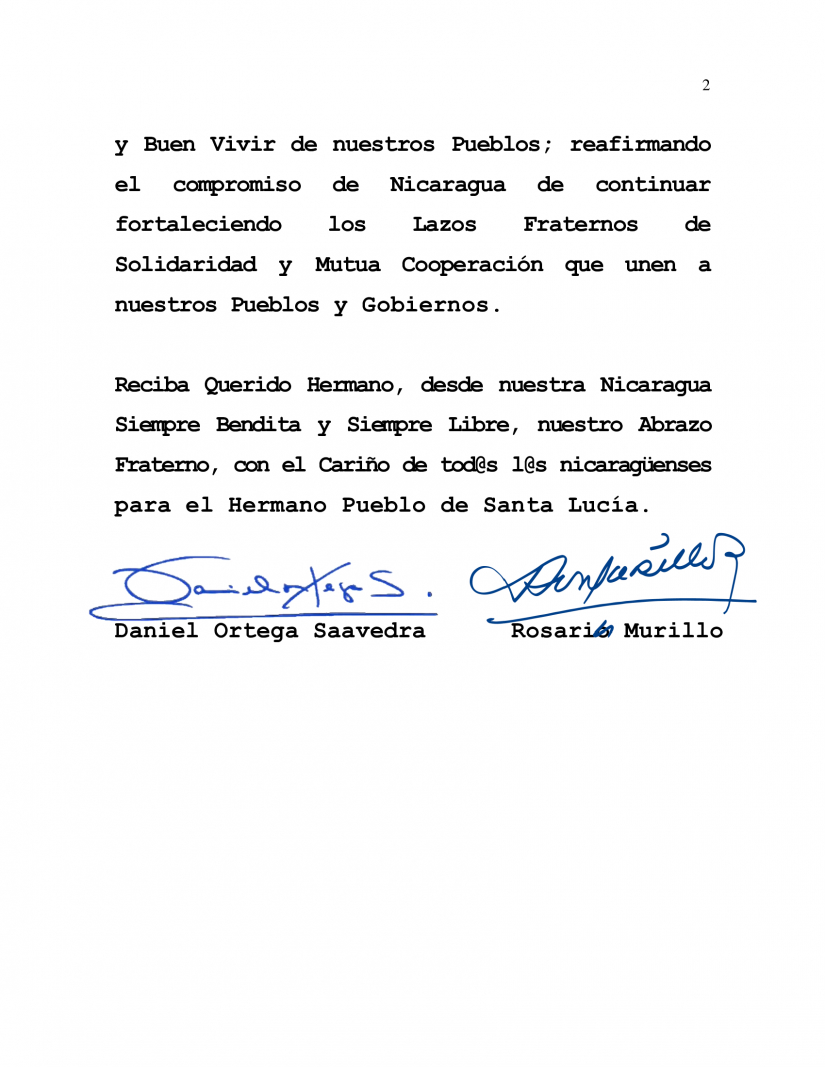 On the special occasion of commemorating the 45th Anniversary of Independence, this coming February 22nd, it fills us with joy to express, on behalf of the People and Government of Reconciliation and National Unity of the Republic of Nicaragua and on our own behalf, our Sincere Congratulations to You, Your Government, and the Brotherly People of Saint Lucia.
