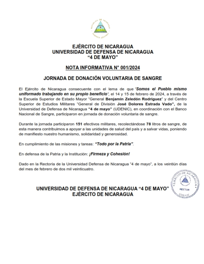 El Ejército de Nicaragua consecuente con el lema de que “Somos el Pueblo mismo uniformado trabajando en su propio beneficio”, el 14 y 15 de febrero de 2024, a través de la Escuela Superior de Estado Mayor “General Benjamín Zeledón Rodríguez” y del Centro Superior de Estudios Militares “General de División José Dolores Estrada Vado”, de la Universidad de Defensa de Nicaragua “4 de mayo” (UDENIC), en coordinación con el Banco Nacional de Sangre, participaron en jornada de donación voluntaria de sangre.