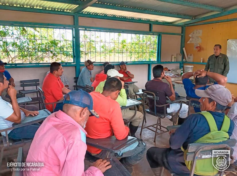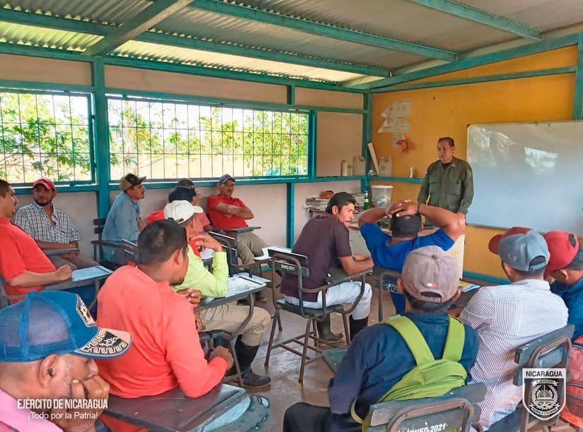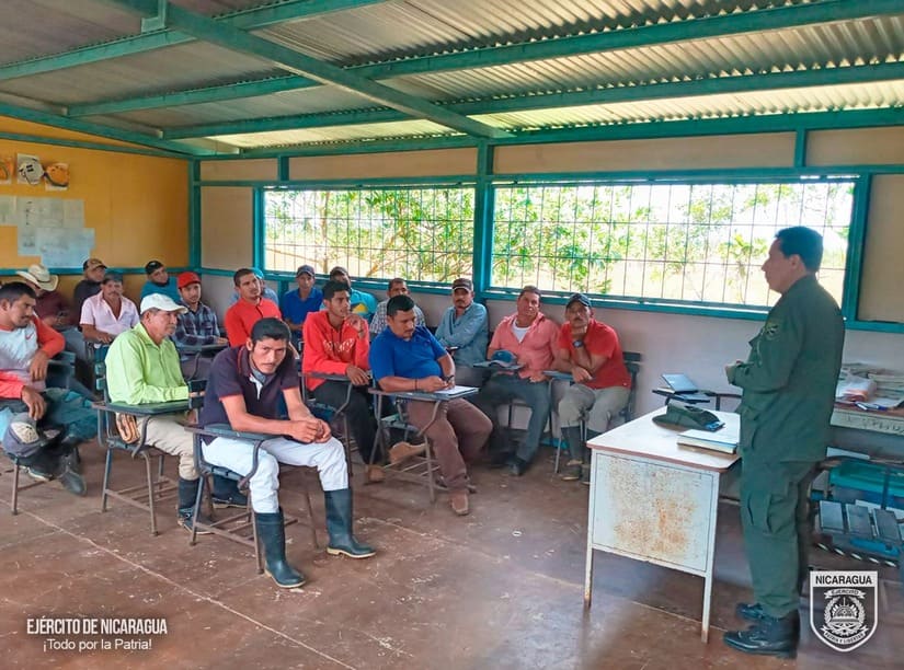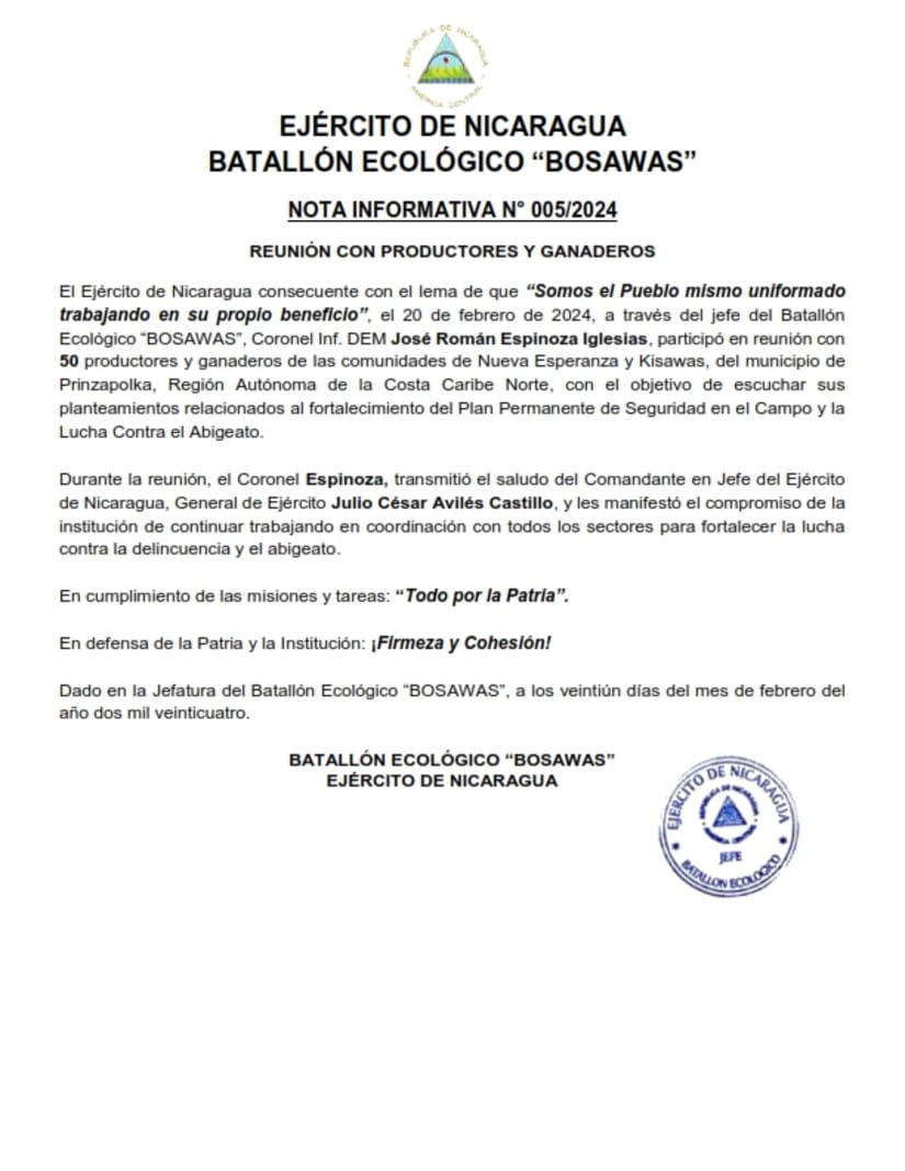 El Ejército de Nicaragua consecuente con el lema de que “Somos el Pueblo mismo uniformado trabajando en su propio beneficio”, el 20 de febrero de 2024, a través del jefe del Batallón Ecológico “BOSAWAS”, Coronel Inf. DEM José Román Espinoza Iglesias, participó en reunión con 50 productores y ganaderos de las comunidades de Nueva Esperanza y Kisawas, del municipio de Prinzapolka, Región Autónoma de la Costa Caribe Norte, con el objetivo de escuchar sus planteamientos relacionados al fortalecimiento del Plan Permanente de Seguridad en el Campo y la Lucha Contra el Abigeato.