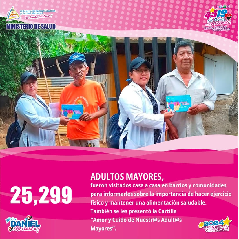 -25,299 Adult@s Mayores visitados en sus casas en Barrios y Comunidades, para informarles sobre la importancia de hacer ejercicio físico y mantener una alimentación saludable. También se les presentó la Cartilla “Amor y Cuido de Nuestr@s Adult@s Mayores”.