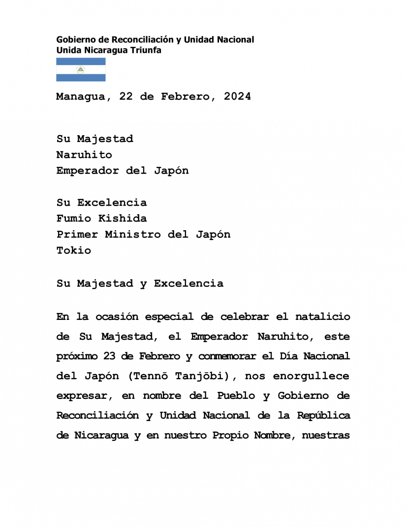 On the special occasion of celebrating the birthday of His Majesty, Emperor Naruhito, this coming February 23 and commemorating Japan's National Day (Tennō Tanjōbi), we are proud to express, on behalf of the People and Government of Reconciliation and National Unity of the Republic of Nicaragua and in our Own Name, our Most Sincere Congratulations to You and to the Brother People and Government of Japan.