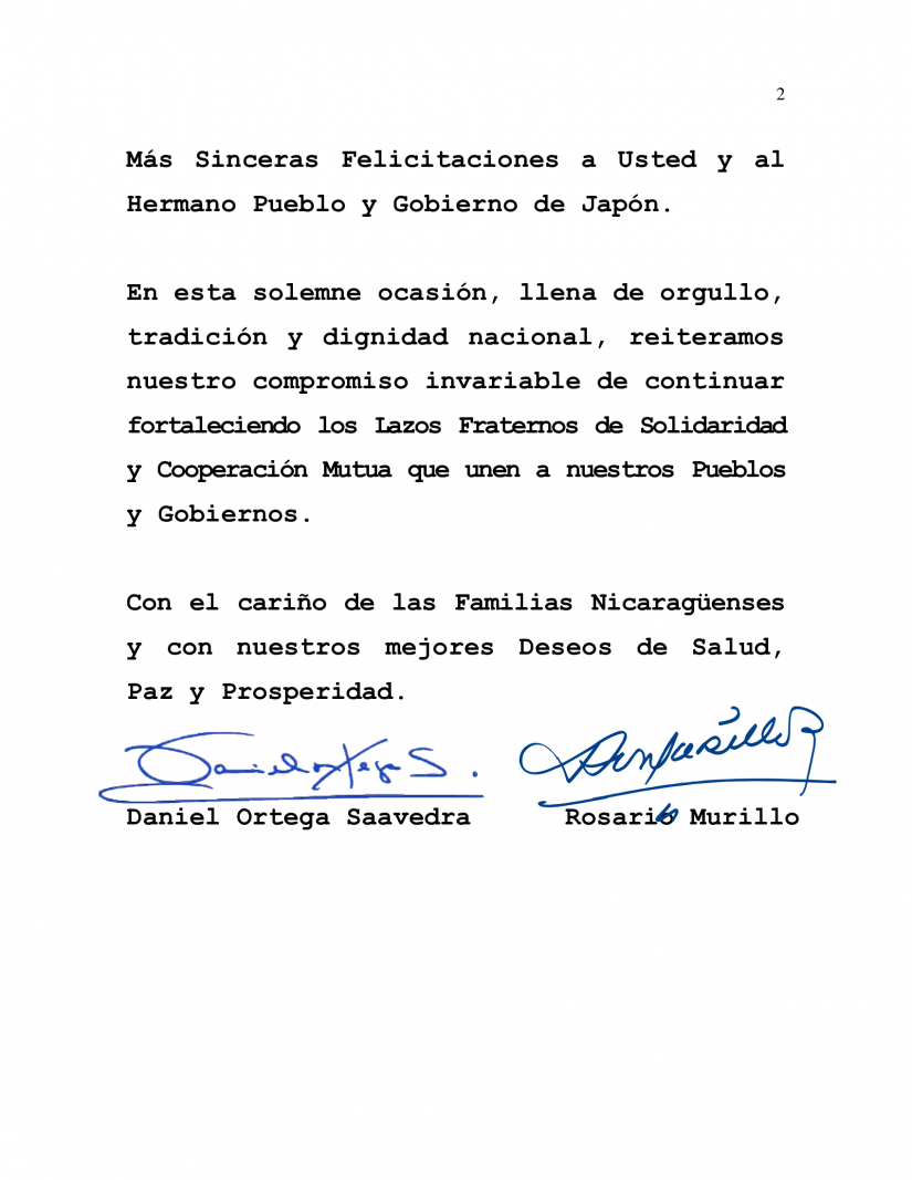 En la ocasión especial de celebrar el natalicio de Su Majestad, el Emperador Naruhito, este próximo 23 de Febrero y conmemorar el Día Nacional del Japón (Tennō Tanjōbi), nos enorgullece expresar, en nombre del Pueblo y Gobierno de Reconciliación y Unidad Nacional de la República de Nicaragua y en nuestro Propio Nombre, nuestras Más Sinceras Felicitaciones a Usted y al Hermano Pueblo y Gobierno de Japón.