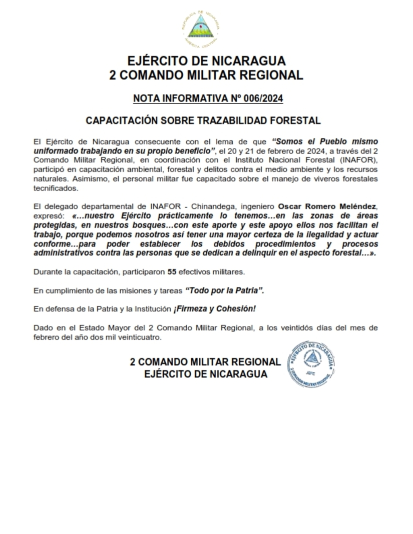 El Ejército de Nicaragua consecuente con el lema de que “Somos el Pueblo mismo uniformado trabajando en su propio beneficio”, el 20 y 21 de febrero de 2024, a través del 2 Comando Militar Regional, en coordinación con el Instituto Nacional Forestal (INAFOR), participó en capacitación ambiental, forestal y delitos contra el medio ambiente y los recursos naturales. Asimismo, el personal militar fue capacitado sobre el manejo de viveros forestales tecnificados.