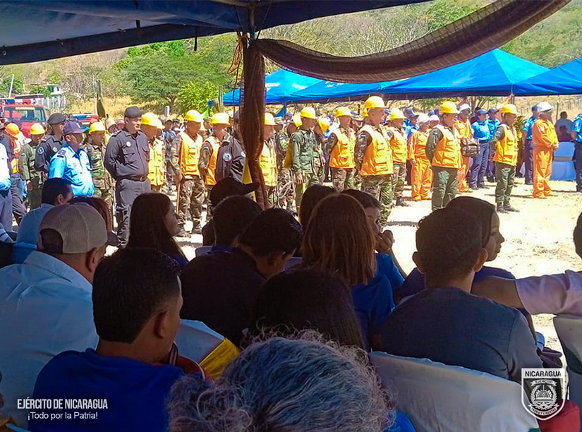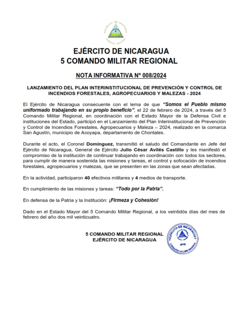 El Ejército de Nicaragua consecuente con el lema de que “Somos el Pueblo mismo uniformado trabajando en su propio beneficio”, el 22 de febrero de 2024, a través del 5 Comando Militar Regional, en coordinación con el Estado Mayor de la Defensa Civil e instituciones del Estado, participó en el Lanzamiento del Plan Interinstitucional de Prevención y Control de Incendios Forestales, Agropecuarios y Maleza – 2024, realizado en la comarca San Agustín, municipio de Acoyapa, departamento de Chontales.