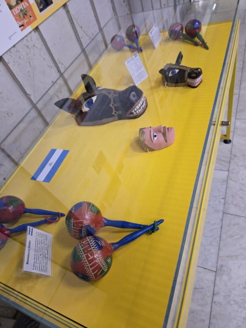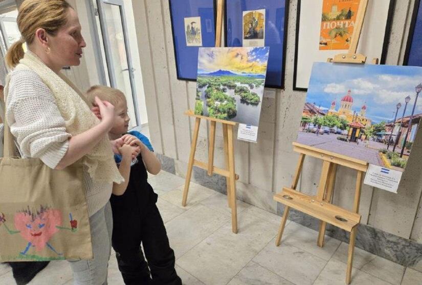 En el marco del conversatorio de Sandino se organizó una exhibición de artesanías y fotografías de los hermosos paisajes nicaragüenses a fin de que los asistentes pudieran apreciar la riqueza cultural de la tierra del General Sandino y Rubén Darío. Además se realizó la presentación de bailes folclóricos con nuestros huipiles tradicionales y el colorido traje del mestizaje que fue muy popular entre estos jóvenes que enviaron a todos los niños de Nicaragua un abrazo de Paz y de Amor Fraterno.