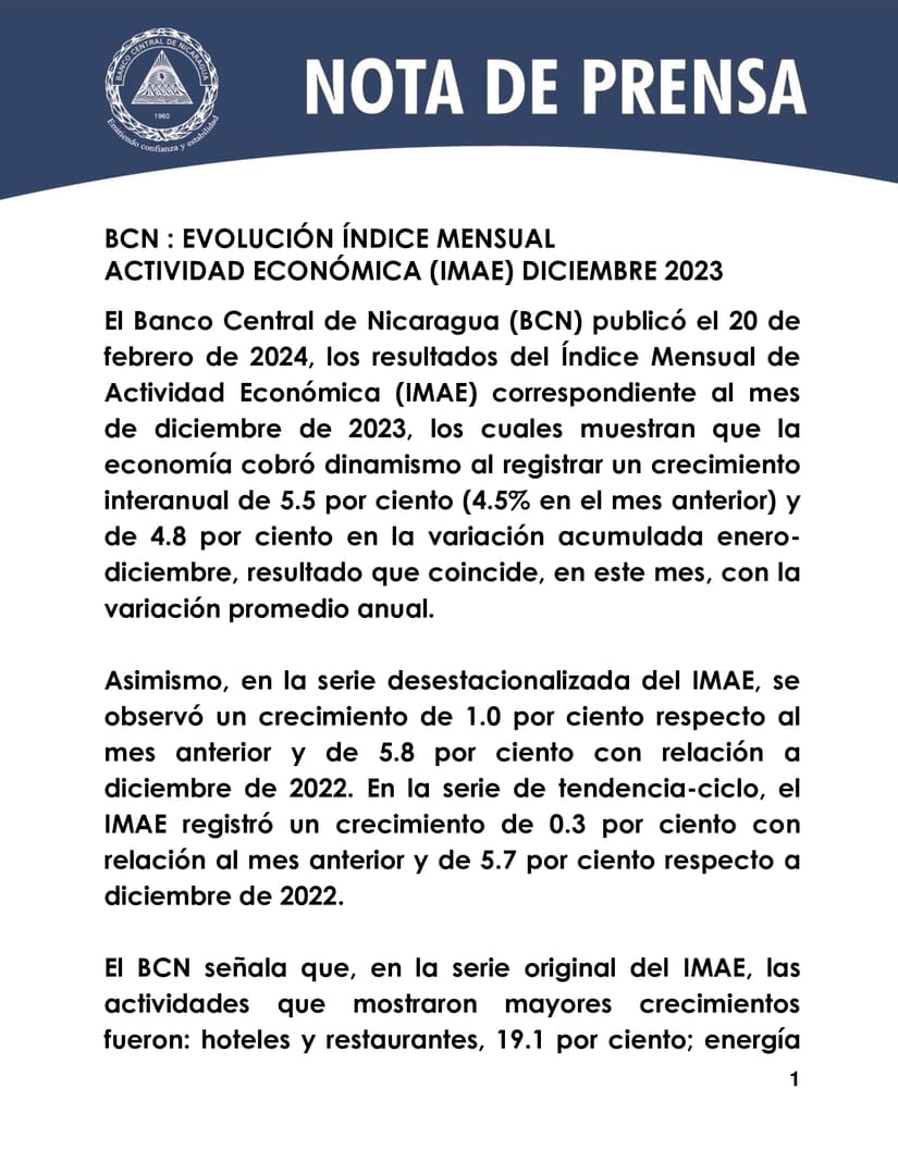 El Banco Central de Nicaragua (BCN) publicó el 20 de febrero de 2024, los resultados del Índice Mensual de Actividad Económica (IMAE) correspondiente al mes de diciembre de 2023, los cuales muestran que la economía cobró dinamismo al registrar un crecimiento interanual de 5.5 por ciento (4.5% en el mes anterior) y de 4.8 por ciento en la variación acumulada enero-diciembre, resultado que coincide, en este mes, con la variación promedio anual.