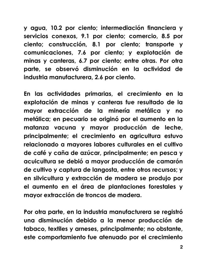 En las actividades primarias, el crecimiento en la explotación de minas y canteras fue resultado de la mayor extracción de la minería metálica y no metálica; en pecuario se originó por el aumento en la matanza vacuna y mayor producción de leche, principalmente; el crecimiento en agricultura estuvo relacionado a mayores labores culturales en el cultivo de café y caña de azúcar, principalmente; en pesca y acuicultura se debió a mayor producción de camarón de cultivo y captura de langosta, entre otros recursos; y en silvicultura y extracción de madera se produjo por el aumento en el área de plantaciones forestales y mayor extracción de troncos de madera.